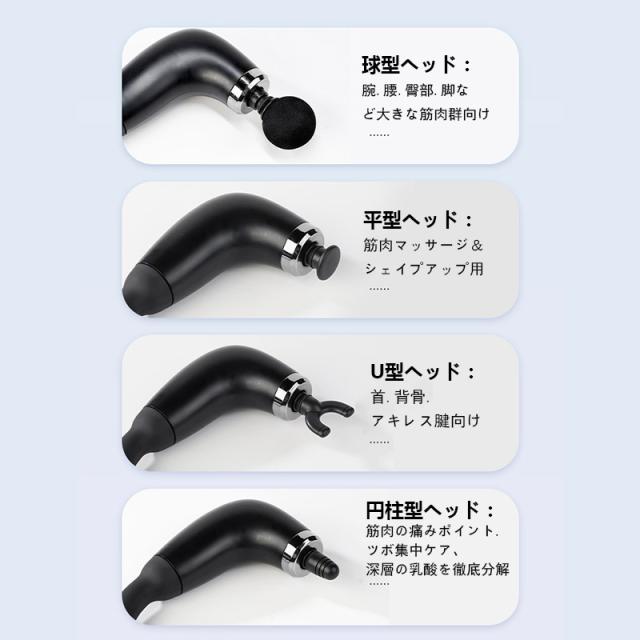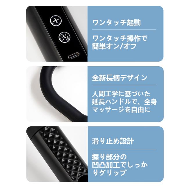 最新の長柄デザインで、より快適な使用感を提供します。体の部位に合わせた効果を発揮出来るように、4つのアタッチメントがついています。U型ヘッド、円柱型ヘッド、球型ヘッドと平型ヘッド があります。