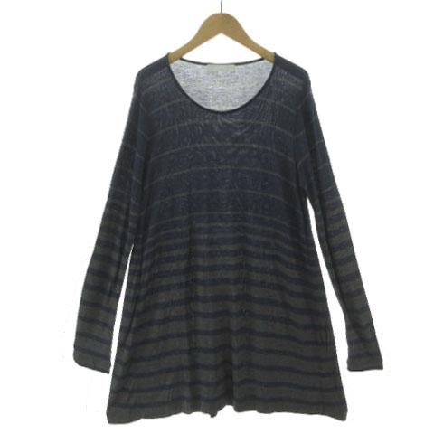 【中古】自由区 オンワード樫山 ニット セーター チュニック丈 長袖 Aライン 薄手 ウール混 ボーダー 紺 グレー 40