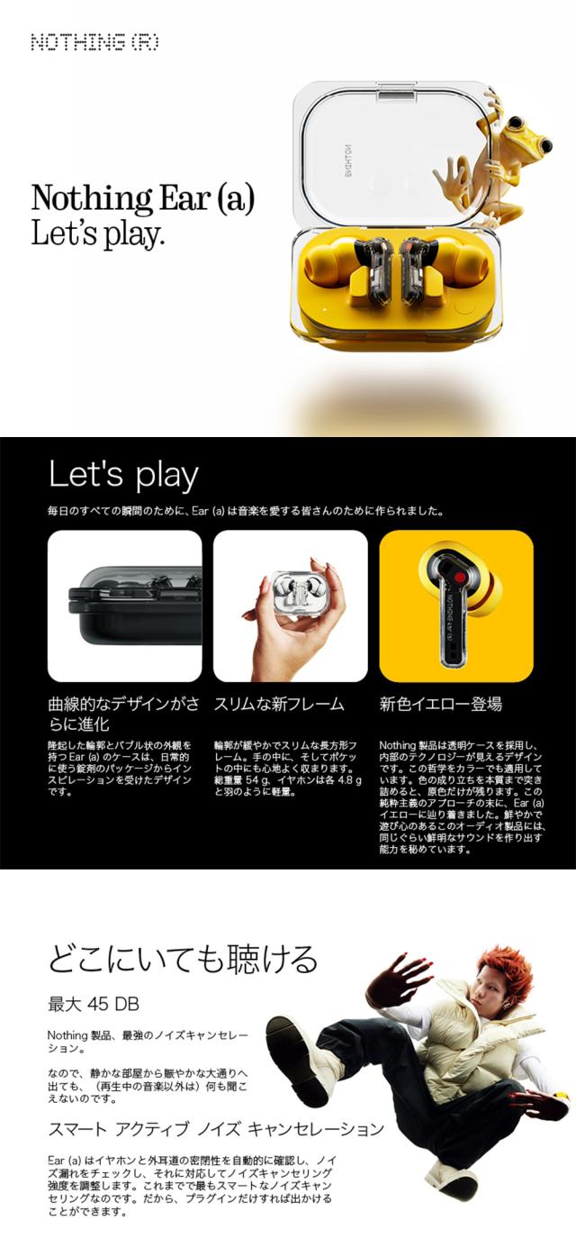 | nothing ear(a) Nothing Ear a nothing ear a ワイヤレスイヤホン Bluetoothイヤホン アクティブノイズキャンセリング ANC クリアサウンド 低遅延モード ハイレゾ対応 LHDC nothing 正規代理店 NOTHING 日本正規代理店 nothing 日本正規品 nothing イヤホン 正規品 nothing ear a 正規品 透明デザイン 軽量イヤホン 長時間再生 急速充電 ワイヤレス充電対応 ENC通話ノイズリダクション 外音取り込みモード bluetooth 5.3 イヤホン 両耳 片耳 イヤホン iPhone Android 対応 ゲーミングイヤホン 音楽イヤホン マイク付きイヤホン ハンズフリー通話 スポーツイヤホン 密閉型 カナル型イヤホン 最新モデル nothing ear a 新モデル nothing 公式 nothing 国内正規品 nothing ear(a) イエロー ブラック ホワイト |