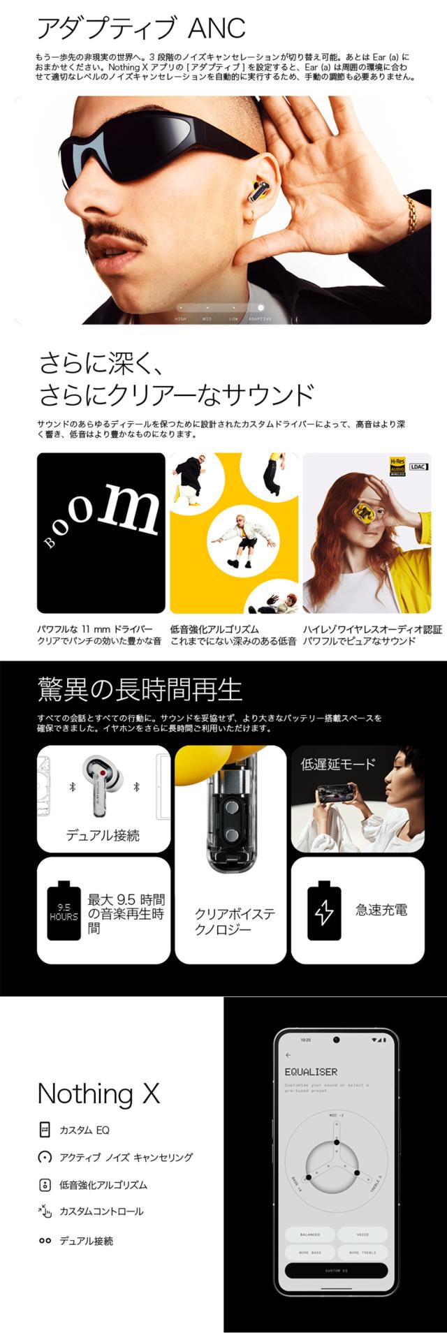 | ブランド |NOTHING 商品名 |Nothing Ear(a) カラー |ホワイト、ブラック、イエロー サイズ |30.9 x 21.7 x 24.3mm(イヤホン本体)/ 47.6 x 63.3 x 22.7mm(充電ケース) 重量 |約 4.8g(イヤホン片耳)、約 39.6g(充電ケース)、合計約 49.2g ワイヤレス接続 | Bluetooth5.3 Bluetoothプロファイル | RFCOMM、SPP、HFP、A2DP、AVDTP、AVCTP、AVRCP コーデック |LDAC、AAC、SBC ノイズキャンセリング |ハイブリットアクティブノイズキャンセリング(最大45dB) マイク | 3つのマイク(片耳)、6つのマイク(両耳) ドライバー |カスタマイズ11mmダイナミックドライバー 周波数範囲 | 5000Hz バッテリー容量 |46mAh(片耳)、500mAh(充電ケース) バッテリー駆動時間 | 音楽再生時 / ANCオフ時: ケース使用時42.5時間、イヤホンのみ使用時9.5時間 | ANCオン時 : ケース使用時24.5時間、イヤホンのみ使用時5.5時間 通話時 / ANCオフ時: ケース使用時23時間、イヤホンのみ使用時5.2時間 | ANCオン時 : ケース使用時18時間、イヤホンのみ使用時4時間 急速充電 | ANCオン時:10分間の充電で約2時間の音楽再生(充電ケースと合わせて約6時間) ANCオフ時:10分間の充電で約3.2時間の音楽再生(充電ケースと合わせて約10時間) 充電方式 |USB Type-C マルチポイント接続 | 対応 防水防塵 | IP54(イヤホン本体)、IPX2(充電ケース) Google Fast Pair |対応 Microsoft Swift Pair |対応 アプリ |Nothing X (iOS 13以降、Android 5.1以降) ※ 日本語対応 その他の機能 |装着検知、低遅延モード、イヤホンを探し パッケージ内容 |イヤホン本体、充電ケース、イヤーパット(S/M/L)、USB Type-Cケーブル、安全情報と保証情報、取扱説明書 |