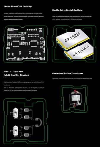 【二重ES9038Q2M DACチップ】2つのESSプロフェッショナルDACチップは、左右のチャンネル信号をそれぞれ処理するために使用され、より低い歪み、より高いSNR、大幅に改善された解像度とより詳細なサウンドパフォーマンスを持っています。AK4118レシーバーチップを採用、PCM 24Bit/384kHz、DSD128までサポート。