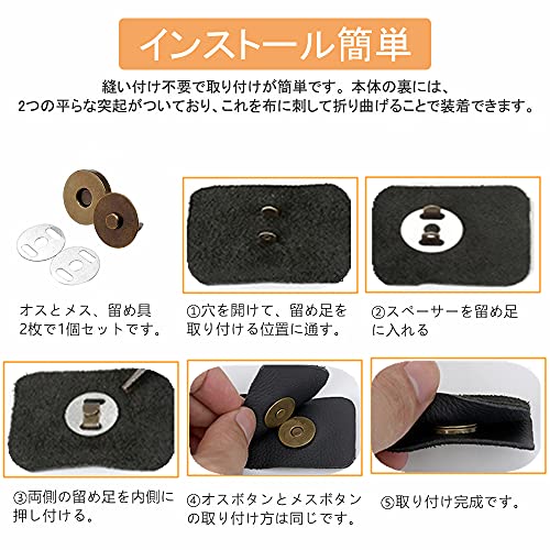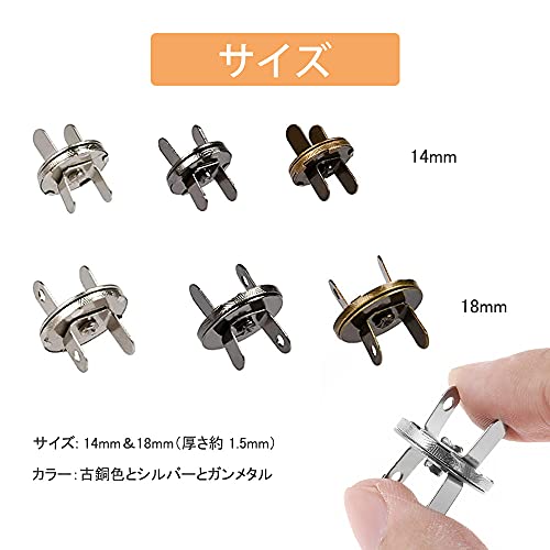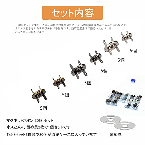 【セット内容】マグネットボタン 30個 セット、5個× 14mm&18mmシルバー、5 個× 14mm&18mmガンメタル、5 個×14mm&18mm古銅色(オスとメス、留め具2枚で1個セットです)各5個セット6種類で30個が収納ケースに入っています。