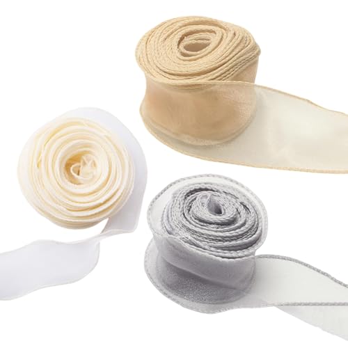 オーガンジーリボン 長さ約9m 幅 4cmリボン 飾り 手芸 ラッピング バレンタイン 無地 ギフトラッピング DIY 花束弓 結婚式パーティーの装飾 ヘアアクセサリー3巻入 (グレー+ゴールド+ベージュ)