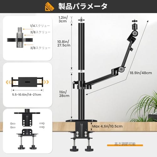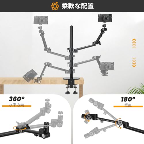 カメラスタンド 配信 卓上 デスクマウントスタンド カメラ アーム 卓上カメラマウント 俯瞰撮影 スマホスタンド 高さ調整可能 頑丈 プロジェクタースタンド カメラ スマートフォン 補助照明 写真撮影 ライブ放送 会議 ビデオ録画