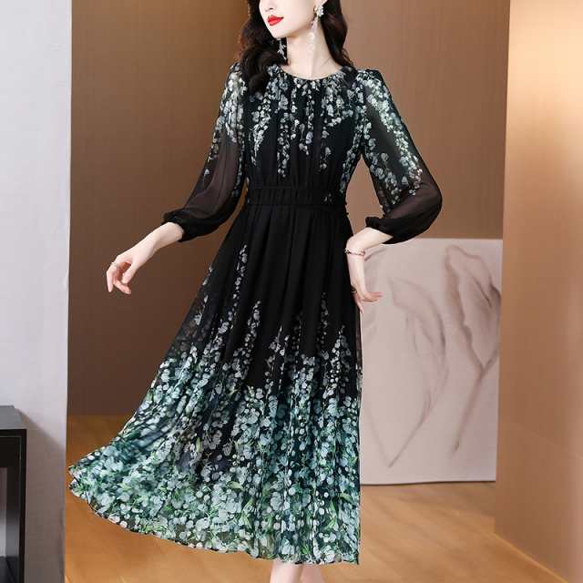 ワンピース 夏 秋 レディース きれいめ 楽ちん マキシワンピース フォーマル 上品 花柄 Aライン シフォン 薄手 九分袖 ナチュラル