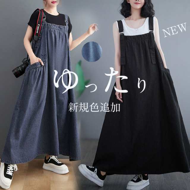 ジャンパースカート デニム デニムワンピース ロング マキシワンピース 春 夏 ロング丈 ジャンスカー 大きいサイズ デニムワンピ カジュアル オールインワン 体型カバー ゆったり