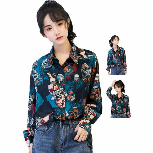 送料無料 レトロ 花柄プリント プリントシャツ シャツ レディース 柄シャツ レトロ柄 長袖シャツ トップス イラスト