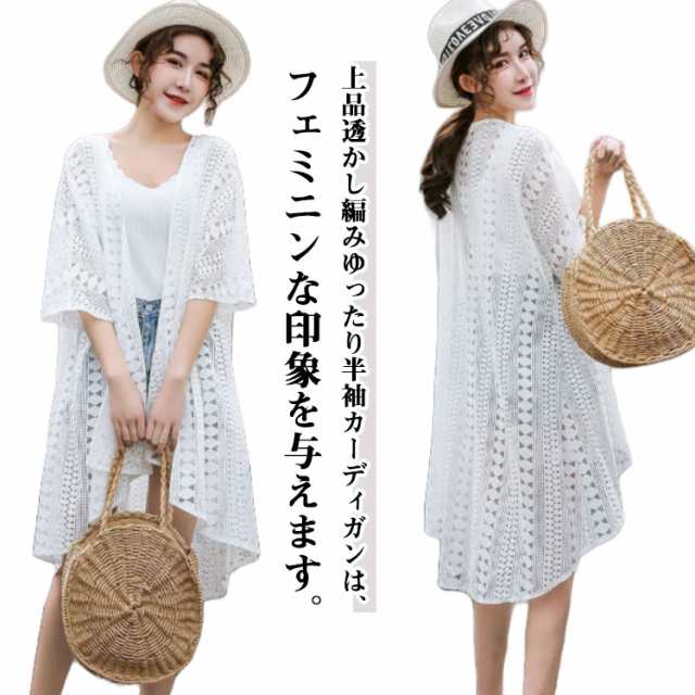 カーディガン 薄手 レディース 透かし彫り レース サマーニット サマーカーディガン 半袖 ロングカーディガン 夏 トップス 紫外線カット ロング 薄手 ドルマンニット カーディガン 透け感