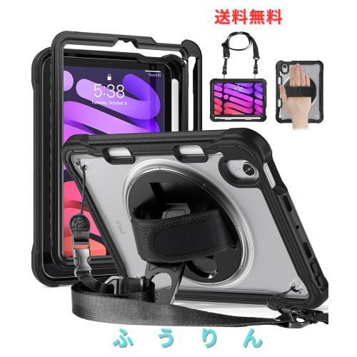 360°回転ベルト iPad Mini 第6世代 / iPad mini 7 ケース 肩掛け ショルダー ペンシル 収納 iPad Mini 6 iPad Mini A17 Pro ケース 耐衝撃 背面 半透明 カバー 縦置き/横置き スタンド,透明