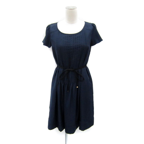 【中古】ナチュラルビューティーベーシック ワンピース ひざ丈 半袖 無地 リボン S 紺 ネイビー /SY43 レディース