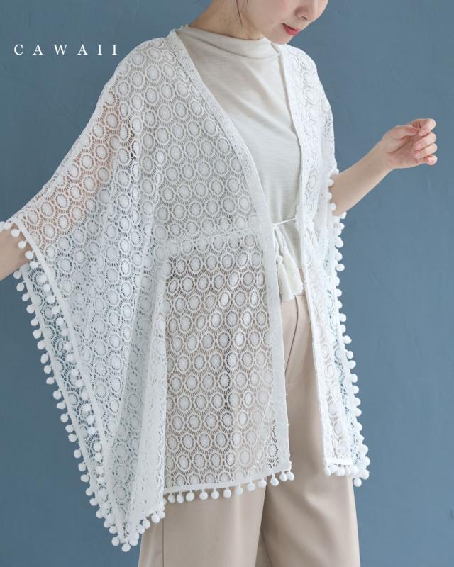 再入荷8月1日 縁取りポンポンのサークルレースカーディガン cawaii w61299ps S~2L対応 羽織り 日焼け対策 冷房対策 ホワイト オシャレ 個性的 大人可愛い エレガント 上品 春服 春物 夏服 夏物 薄手 レディース ファッション ミセス 30代 40代 50代