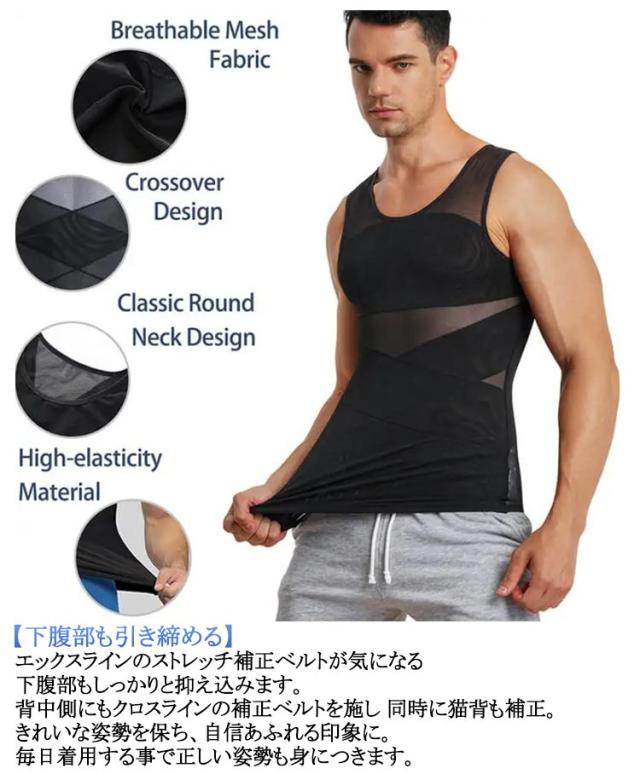 | 最強垂れ胸補正!! 加圧インナー 【着た瞬間、着やせ効果】運動してもなかなか結果が出ない、間に合わない。今日だけスリムに見せたい!そんな希望を叶える加圧インナーが出来ました! 補正インナーとしても、スポーツ時の加圧シャツとしても、姿勢を綺麗に見せる下着としてもマルチに使えるインナーアイテムです。 【乳首が浮かない】薄めのTシャツやニットを着用した際の乳首浮き、透けをパワーネットがしっかりガード!!自然なフラットなシルエットに見せられるので、いつものお洋服のインナーに使うだけで一気にスタイリッシュなルックスに仕上がります。 ニップレスなど貼り付けるものは手間がかかりコスパもかかりますが、このインナーがあれば今まで諦めていたファッションにもトライできます。 【下腹部も引き締める】エックスラインのストレッチ補正ベルトが気になる下腹部もしっかりと抑え込みます。背中側にもクロスラインの補正ベルトを施し 同時に猫背も補正。きれいな姿勢を保ち、自信あふれる印象に。毎日着用する事で正しい姿勢も身につきます。 【加圧トレーニングにも】しっかりと圧がかかるので効果的なトレーニングが可能。ゴルフやジム、 ジョギングの際にも胸や贅肉が揺れるのを防ぐため快適にワークアウトを楽しむことができます。 【苦しいだけのインナーはもう卒業 】通気性のいいメッシュ生地で長時間の着用も蒸れにくく、汗も乾きやすい。細やかなパワーネットは優れたストレッチ性を発揮するので 補正はしつつ窮屈感を抑えたストレスフリーな造りになっています。服の下でも目立たず、自然なカバーレイヤーのため、普段の会社でのインナーとしてもおすすめです。 ※楽に着用する方法 生地を傷めず長くご使用いただくためにも、下から履くように着用し、片手ずつ腕をアームホールよりお出しください。 | |