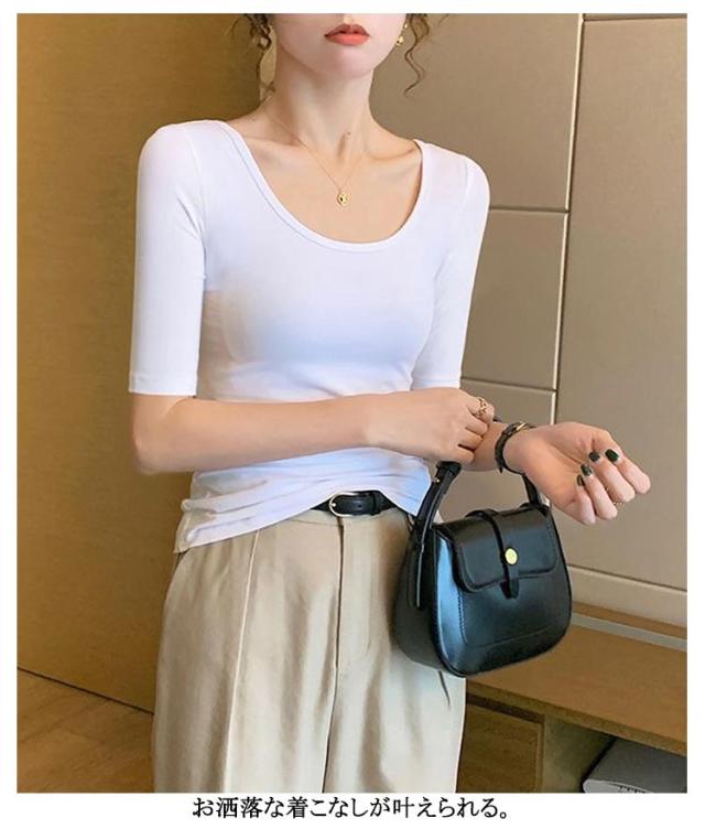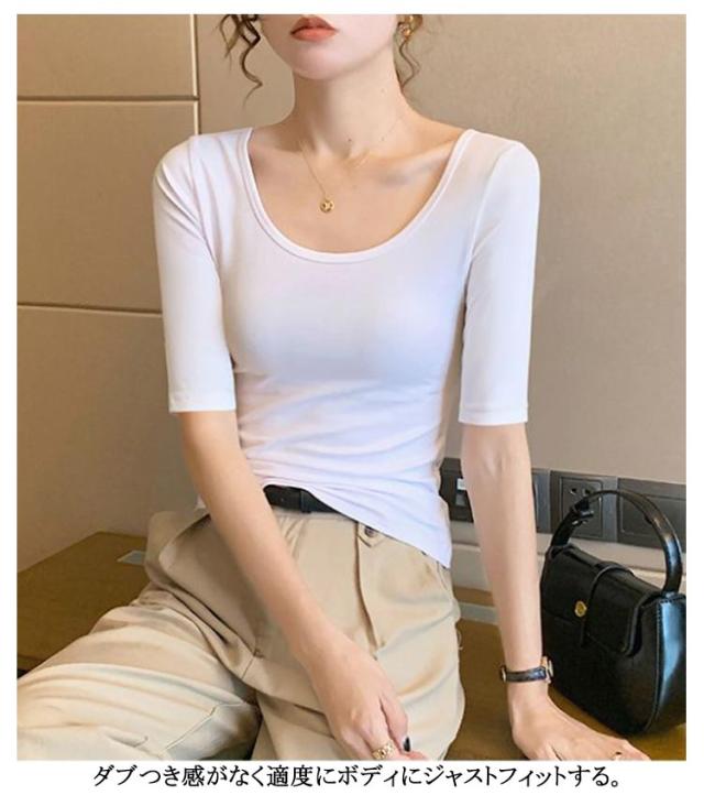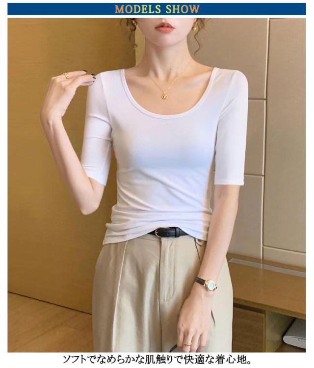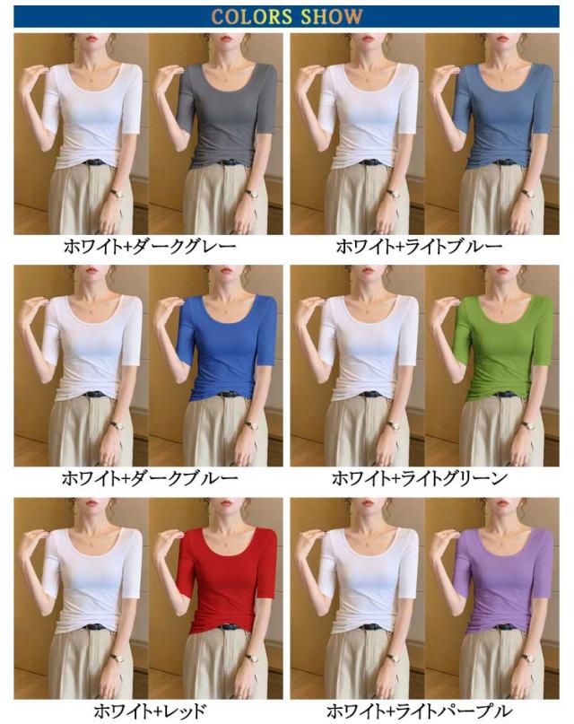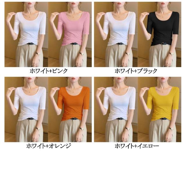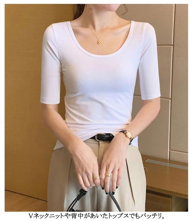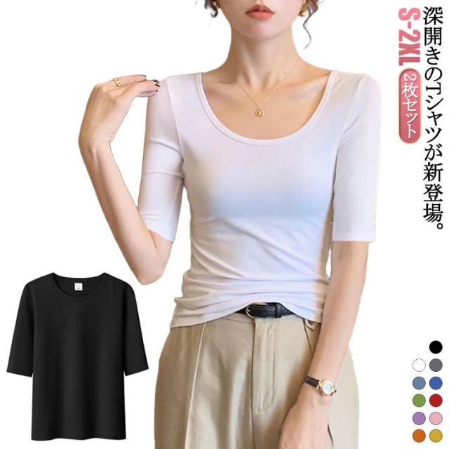 深あき インナー レディース 5分袖 tシャツ カットソー インナーシャツ 2枚セット 深開き 春 夏 肌着 Uネック 襟ぐり広め 無地 シンプル 薄手 肌着 送料無料