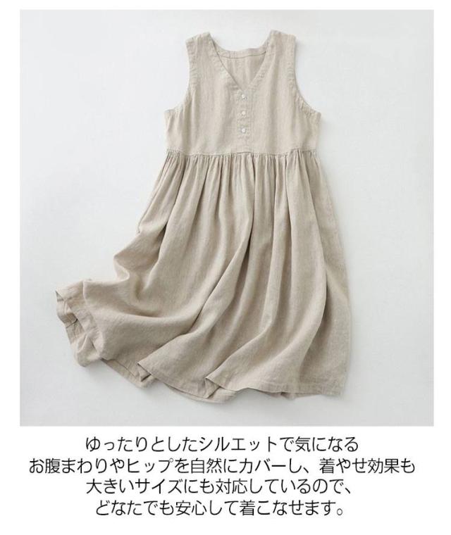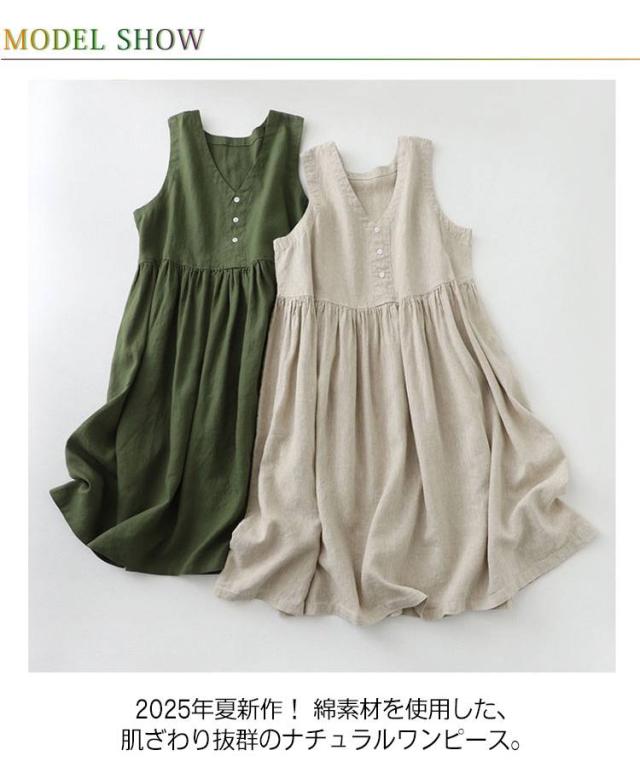 | 2025年夏新作! 綿素材を使用した、肌ざわり抜群のナチュラルワンピース。 Vネックがデコルテを美しく見せ、すっきりとした印象に。 ゆったりとしたシルエットで気になるお腹まわりやヒップを自然にカバーし、着やせ効果も◎。 風通しの良いノースリーブデザインで、暑い季節でも涼しく快適に着用可能。 シンプルな無地デザインはコーディネートしやすく、サンダルやスニーカーなどの小物次第でナチュラル系にもカジュアル系にも着回せます。 大きいサイズにも対応しているので、どなたでも安心して着こなせます。 | |
