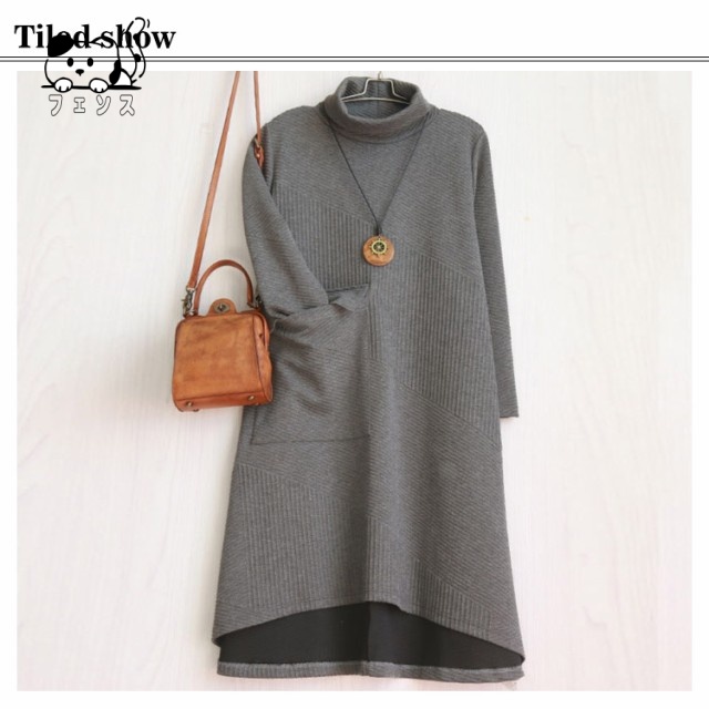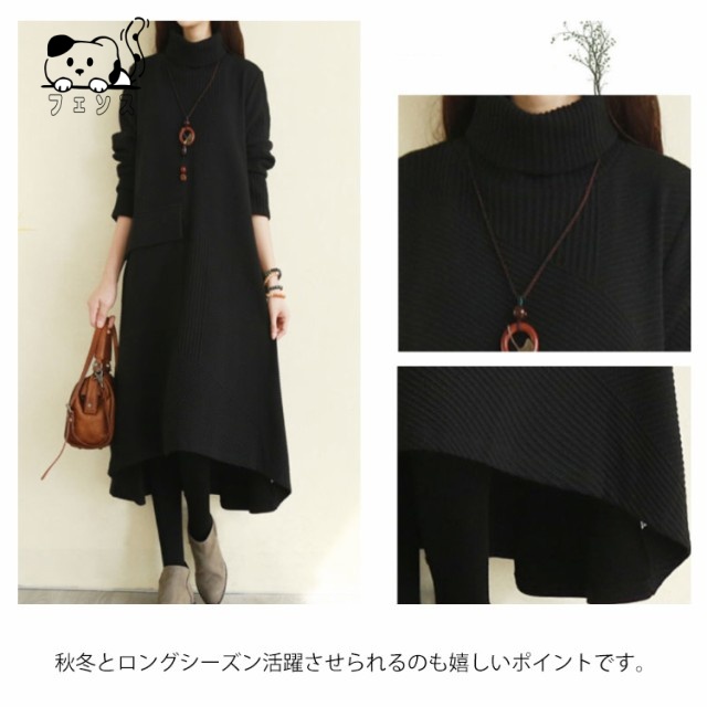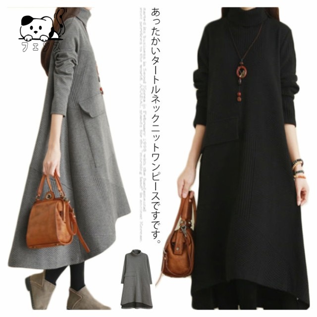 話題商品 ランキング常連 ワンピ タートルネック 体型カバー 長袖 ワンピース ビッグシルエット カジュアル 送料無料 無地 大人 ポケット付き Aライン 秋 秋冬 上品 シンプル レディース 秋物 厚手 ロングワンピース ゆったり ニット 大きいサイズ 送料無料