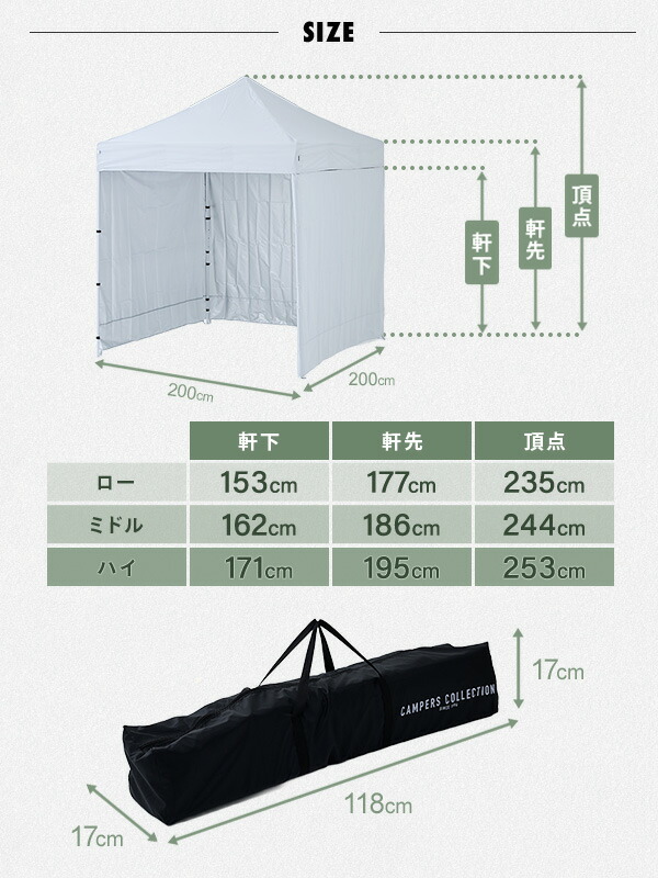 | 商品説明 | ●折りたたみ時サイズ:幅17×奥行17×高さ118cm ●サイドシート3枚付き ●フレームは丈夫なスチール製 ●耐水圧2000mm ●高さ3段階調節可能(頂点部235cm/244cm/253cm) ●組み立ては広げるだけの簡単設置 ●コンパクトに収納可能 ●UPF50+加工のシルバーコーティング生地採用 ●UV遮蔽率99.2%の優れたUVカット ●付属品:ロープ10本、ペグ14本 |