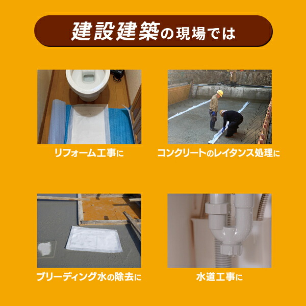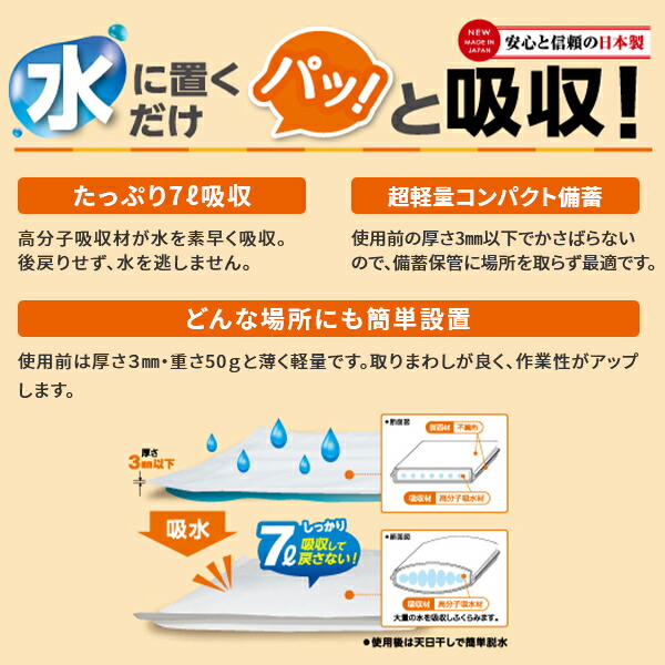 | 商品説明 | ●1枚で約7Lの水を吸収 ※海水、油は吸収しません ●身のまわりの水処理、雨漏り、浸水防止に ●使用前は厚さ約3mm、重さ約60gと保管にも最適 ●銀イオン加工 ●安心と信頼の日本製 ●1袋10枚入り ※止水材としての使用は出来ません ※使用後は3日程天日干し、もしくは脱水剤を利用して排水後に地域の規則に従って廃棄してください ※吸水後の再利用は出来ません |
