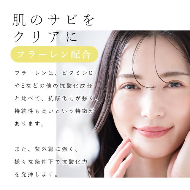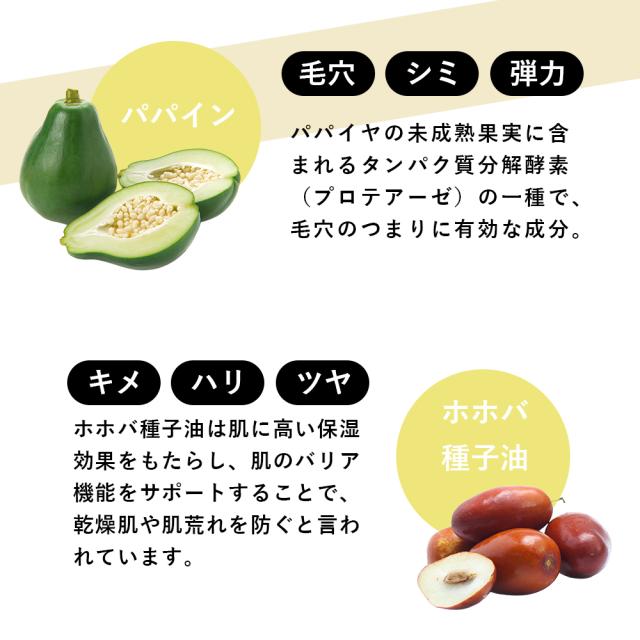 | 全成分 | 水、BG、DPG、グリセリン、シクロヘキサシロキサン、エチルヘキサン酸セチル、トリ(カプリル酸/カプリン酸)グリセリル、ステアリン酸グリセリル(SE)、ステアリルアルコール、PEG−60水添ヒマシ油、トリイソステアリン酸PEG−20グリセリル、イソステアリン酸、ホホバ種子油、イソステアリン酸ポリグリセリル−2、ベヘン酸、アルギニン、シクロペンタシロキサン、デキストリン、グリチルリチン酸2K、トコフェロール、パパイン、PVP、アルニカ花エキス、オドリコソウ花エキス、オランダカラシ葉/茎エキス、ゴボウ根エキス、セイヨウアカマツ球果エキス、セイヨウキズタ葉/茎エキス、ニンニク根エキス、ローズマリー葉エキス、ローマカミツレ花エキス、フラーレン、香料 |