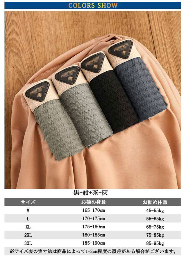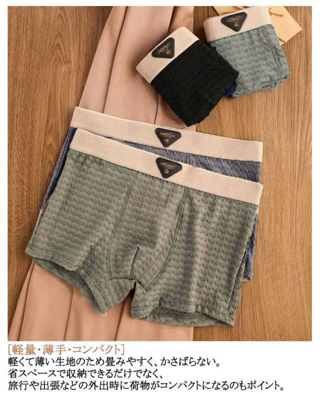 | メンズ冷感ボクサーパンツ 4枚セット! [ツルツル・サラサラ素材] 肌触りの良いなめらかな生地でやみつきになる快適な穿き心地。伸縮性・通気性も良くスポーツなど運動の際にも着用可能。 [抜群の通気性] 高い通気性で蒸れにくく快適な着用感を継続させます。 [抜群の伸縮性] 縦・横・斜め全方向に伸びる超伸縮素材で空札にぴったりフィット。スポーツなどの運動の際にも使える抜群の着用感です。 [ストレッチテープ仕様のウエスト] ゴムを縫い付けるのではなく折り返した生地にストレッチテープを圧着。跡がつきにくく痒みなどのストレスを軽減。 [自然にフィットする立体構造] 人間工学に基づいた立体構造で違和感なくフィット。過度な締め付けによるストレスや群れを軽減し快適な着用感。 [軽量・薄手・コンパクト] 軽くて薄い生地のため畳みやすく、かさばらない。省スペースで収納できるだけでなく、旅行や出張などの外出時に荷物がコンパクトになるのもポイント。 | |