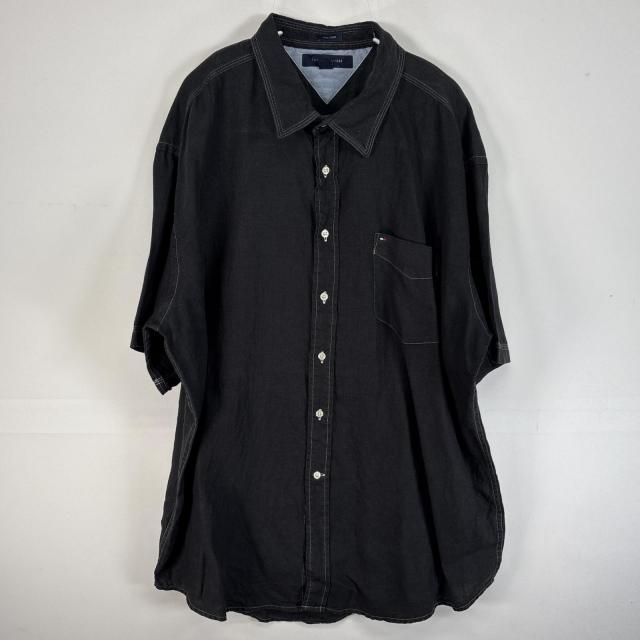 古着 トミーヒルフィガー TOMMY HILFIGER 半袖シャツ ロゴ 刺繍 大きいサイズ リネン XL ブラック 無地 メンズ