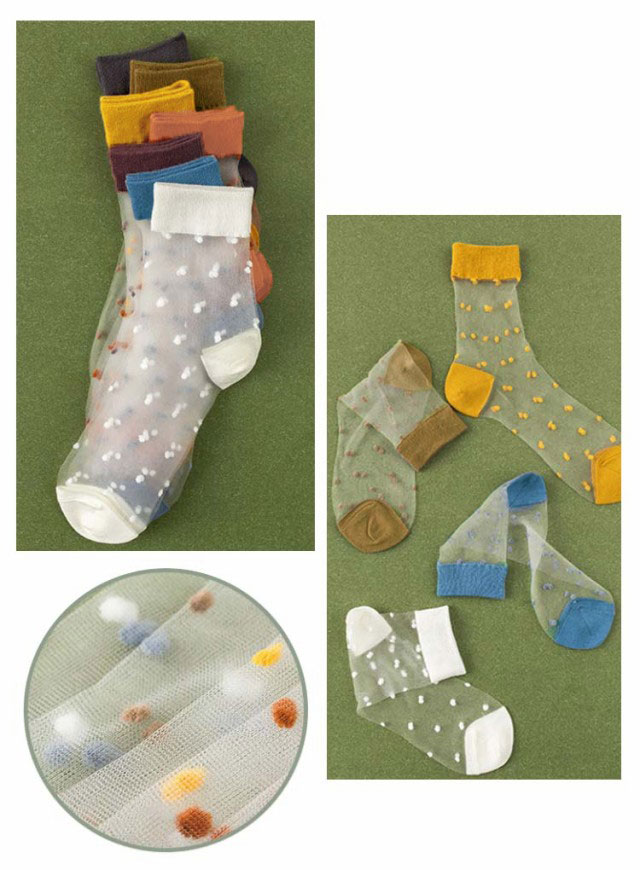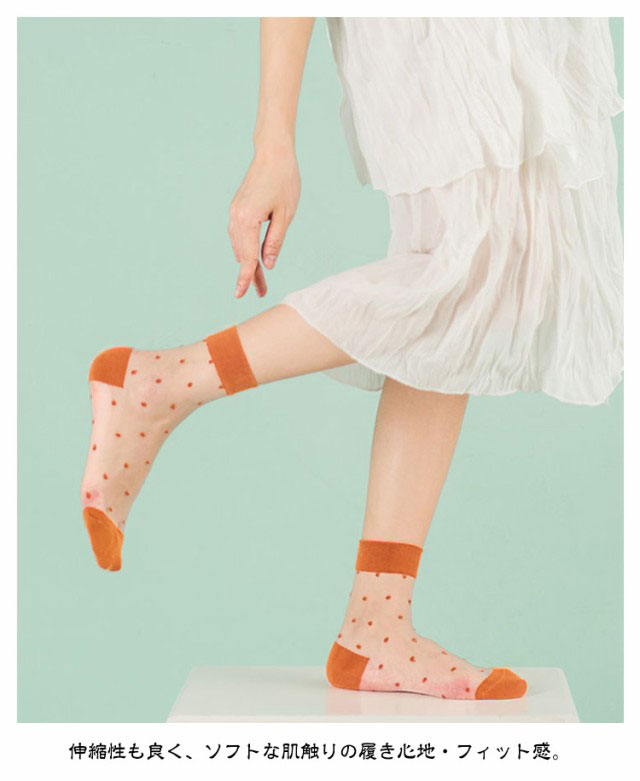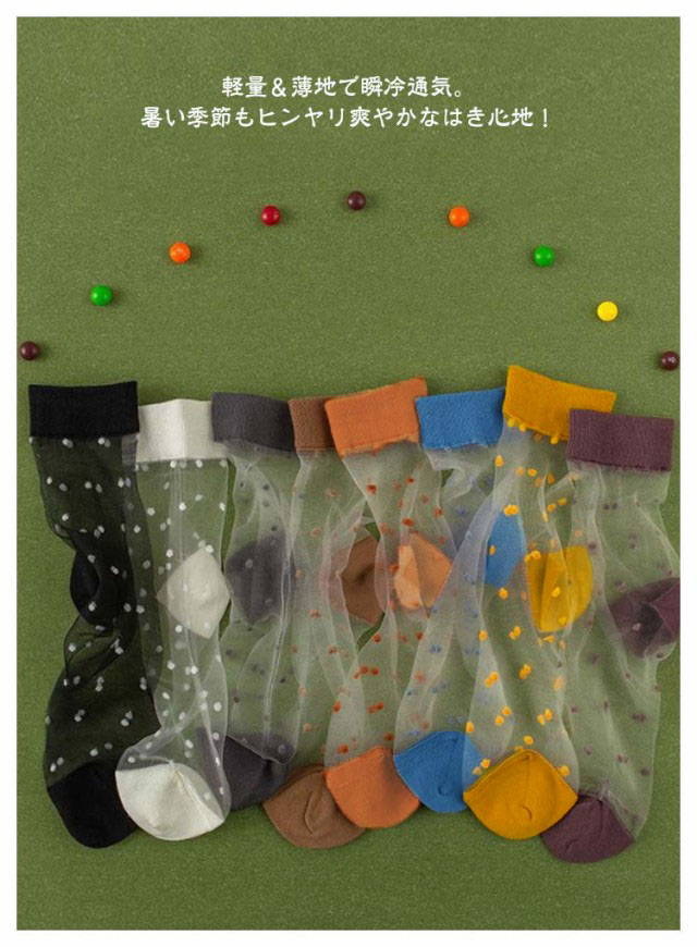 | 可愛いドット柄のシースルーソックス。【5足組】 透け感のあるデザインは夏でも涼しく履いていただけます。 足に優しくフィットして快適な履き心地で、汗ばむこれからの季節にピッタリです。 サンダルやパンプスと合わせることでぐっとおしゃれに! ソフトで軽いシアー素材が足を包み込むから、ずっと快適でいられる。 伸縮性も良く、ソフトな肌触りの履き心地・フィット感。 軽量&薄地で瞬冷通気。暑い季節もヒンヤリ爽やかなはき心地! | |