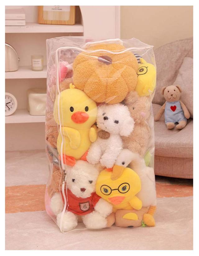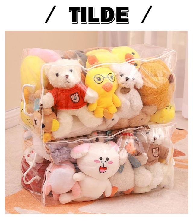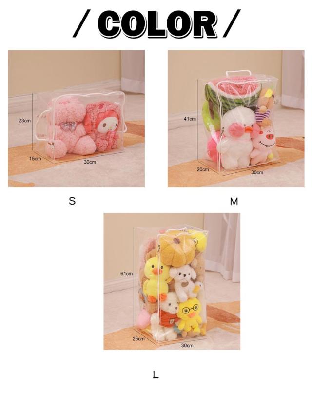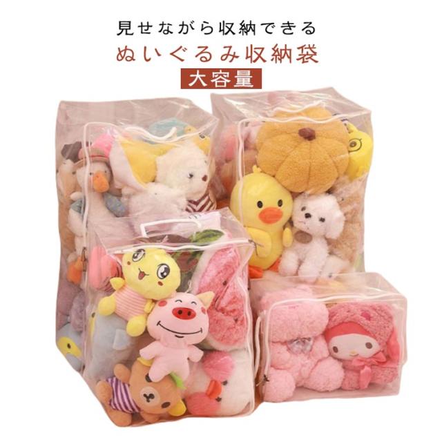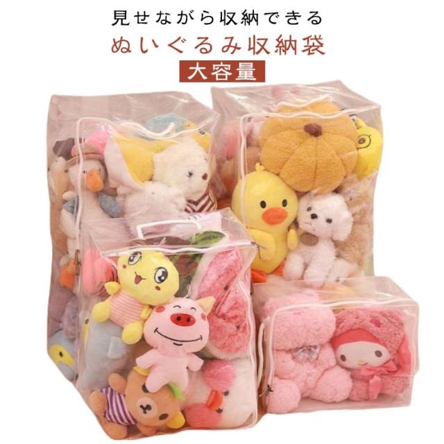 | 見せながら収納できるぬいぐるみ収納袋。 防塵・防水素材で、お気に入りのぬいぐるみがいつも綺麗なまま保管できます。 クリアなので、中身が見えるから確認が簡単にできます。 玩具やぬいぐるみはもちろん、バッグ、ストール、マフラー、衣類、布団など様々な物を収納できる多機能収納ケースです。 | |