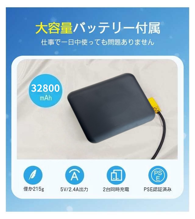 ファン付き作業服は22800mAhの大容量バッテリーが付属し、最大約22時間連続稼働可能です。