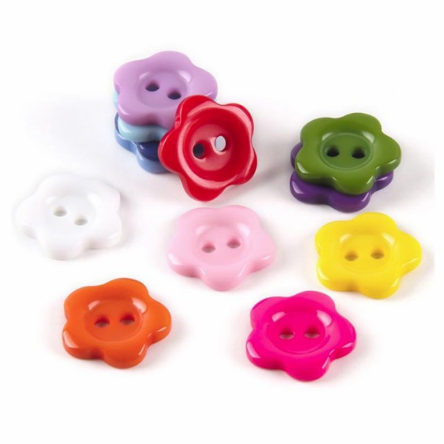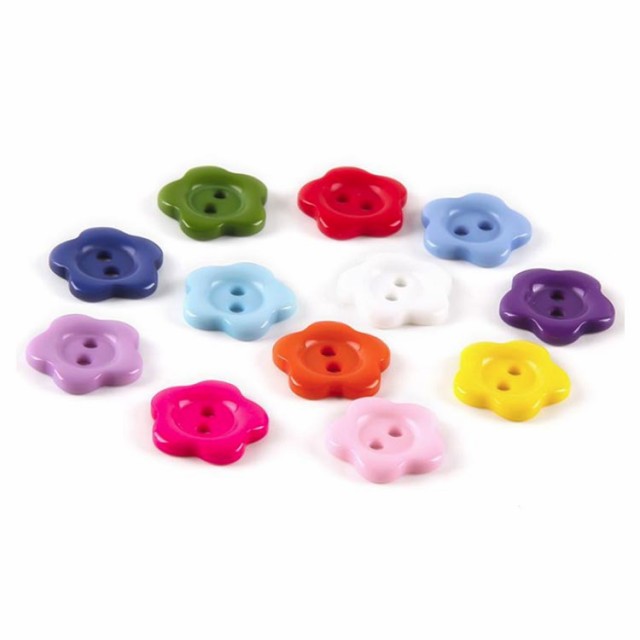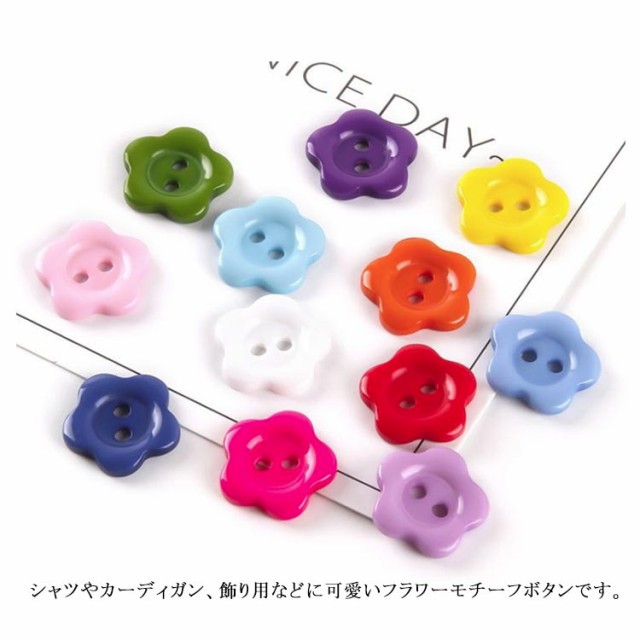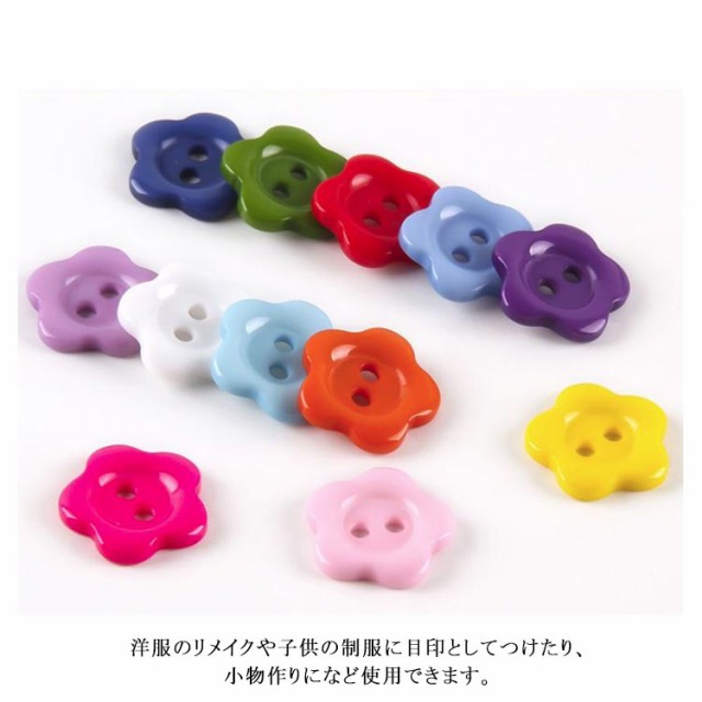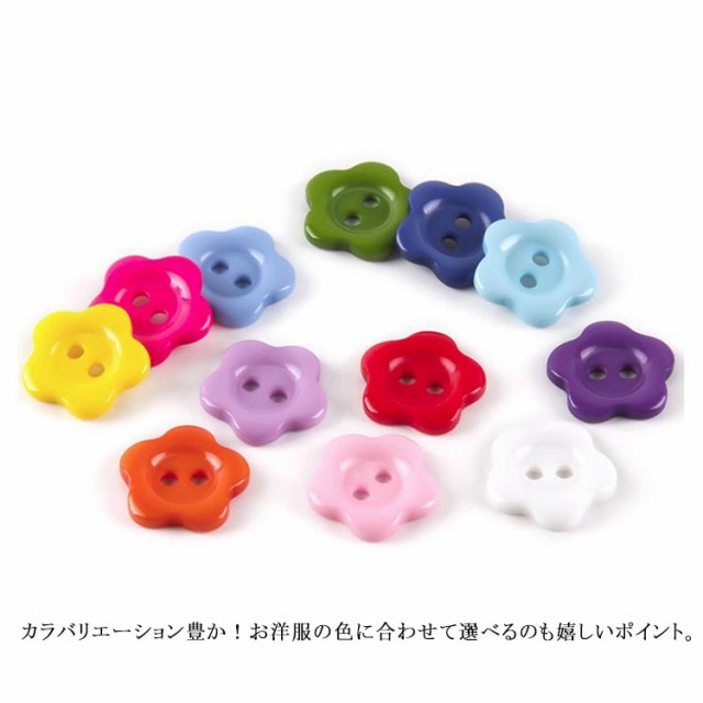 | 15mm 可愛い花型ボタン50個入り。 カラバリエーション豊か!お洋服の色に合わせて選べるのも嬉しいポイント。 洋服のリメイクや子供の制服に目印としてつけたり、小物作りになど使用できます。 シャツやカーディガン、飾り用などに可愛いフラワーモチーフボタンです。 | |