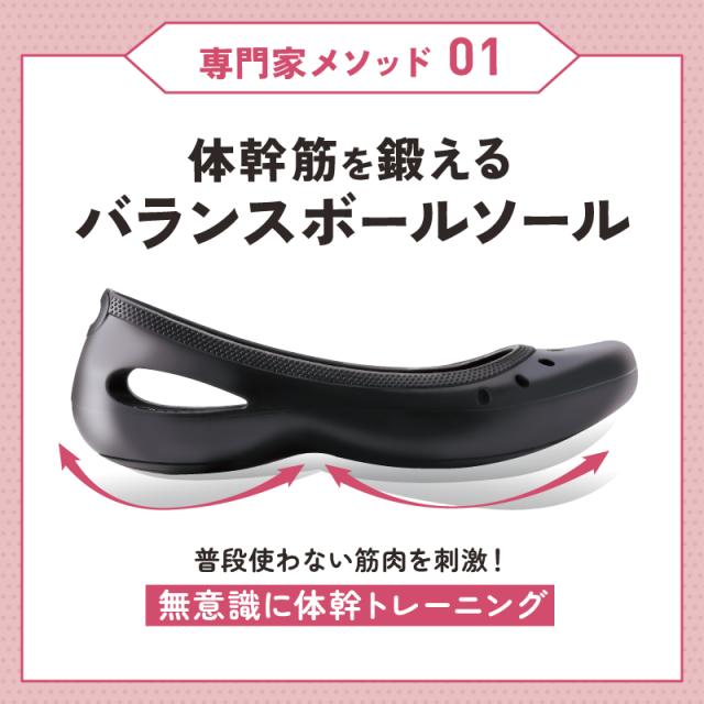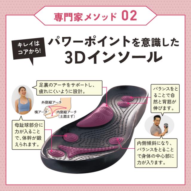 クッション性の高いバランスボール形状のアウトソールと、3Dインソールで体幹筋を鍛えて、痩せやすい体づくりへ!