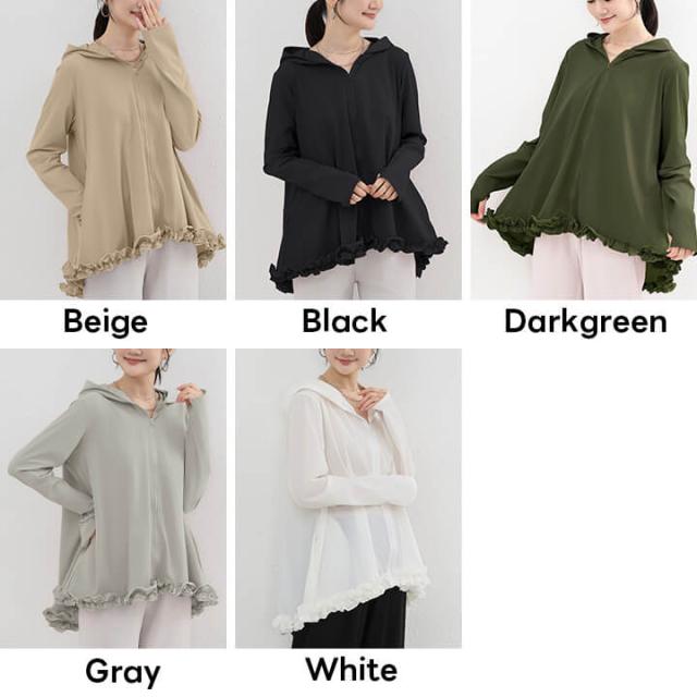 ラッシュガード レディース 紫外線対策 夏 春 UVカット 日焼け対策 ラッシュパーカー 涼しい フリル ギャザー 可愛い パーカー 指穴付き フィンガーホール付き フードあり ドルマンシルエット ポケット付き 長袖 普段着 水着 ビーチ 海 サーフィン アウトドア フィットネス 散歩 スポーツウェア 無地 シンプル ベージュ 肌色 ブラック 黒 ダークグリーン 深緑 グレー 灰色 ホワイト 白 女性 M L XL 9号 11号 20代 30代 1代 10代 yc1306b