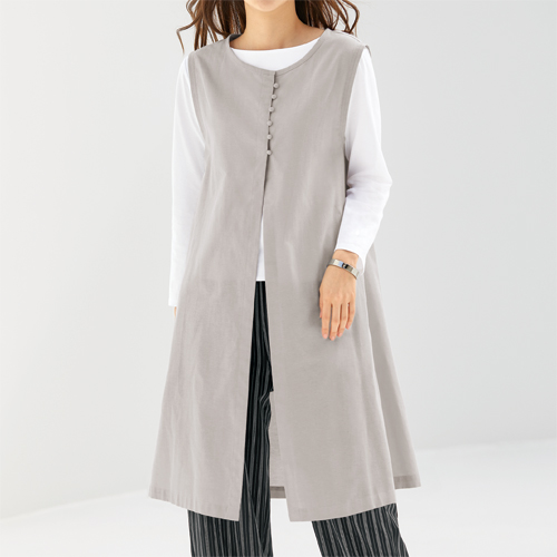 綿混 多ボタンロングジレ ライトグレージュ ベスト ジレ 前開き ロング丈 レディース 婦人服 ミセス シニア 女性 大人 グレー 丸首 クルーネック チョッキ シンプル 体型カバー おしゃれ シニアファッション 40代 50代 60代 70代 80代 90代 母の日 お母さん おばあちゃん 春物 夏物 春夏