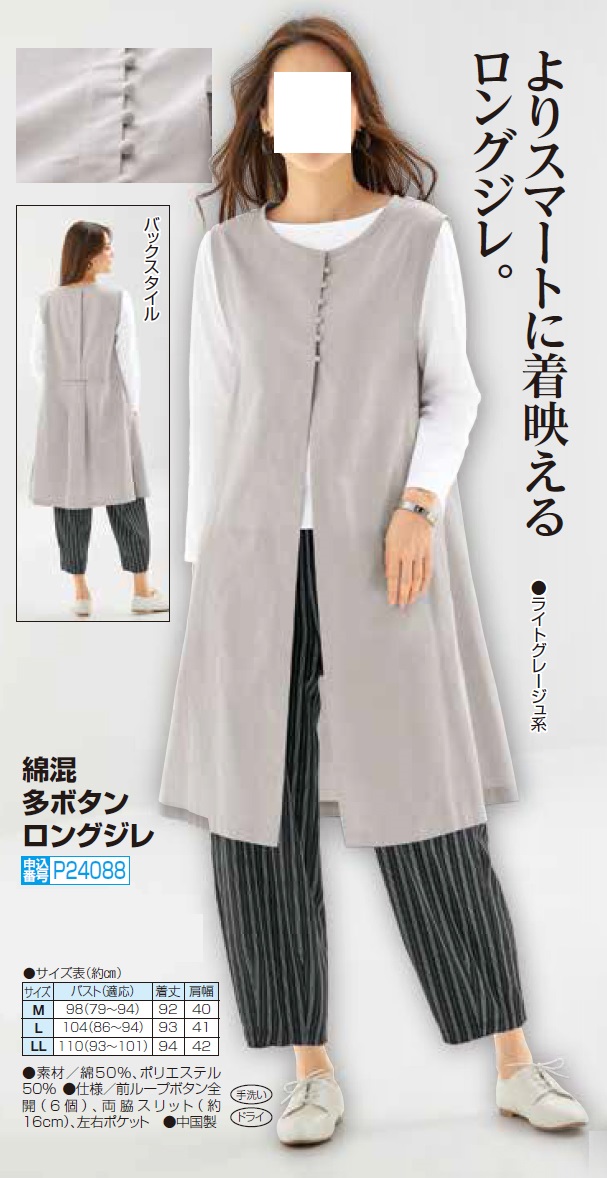 綿混 多ボタンロングジレ ライトグレージュ ベスト ジレ 前開き ロング丈 レディース 婦人服 ミセス シニア 女性 大人 グレー 丸首 クルーネック チョッキ シンプル 体型カバー おしゃれ ファッション 40代 50代 60代 70代 80代 90代 母の日 お母さん 春夏 nss p24088