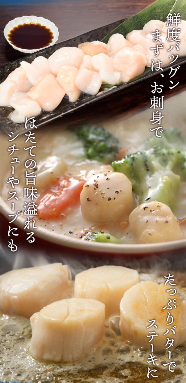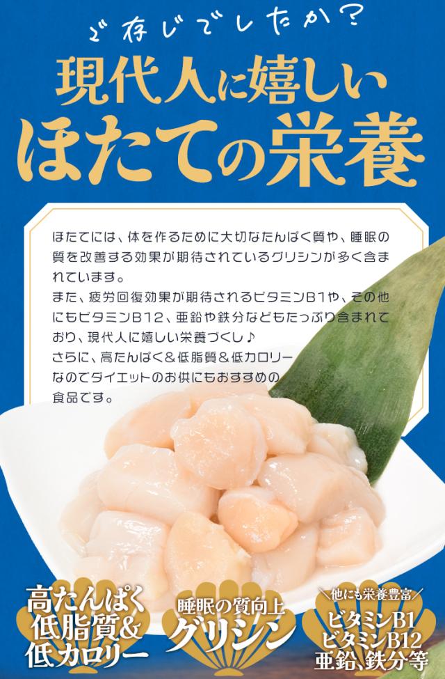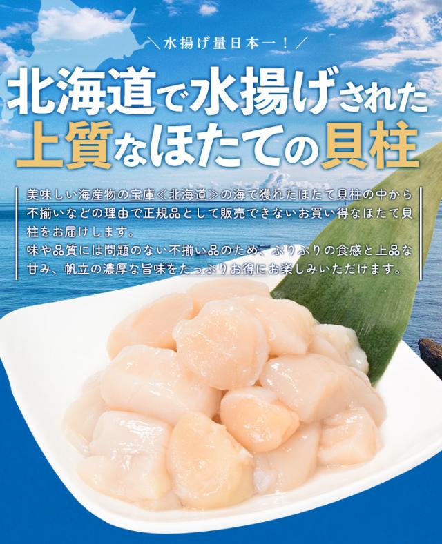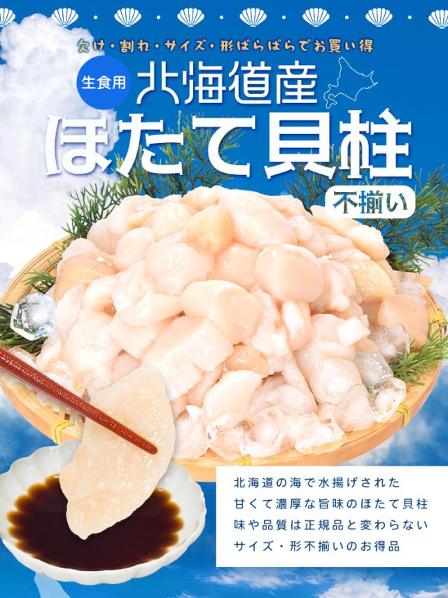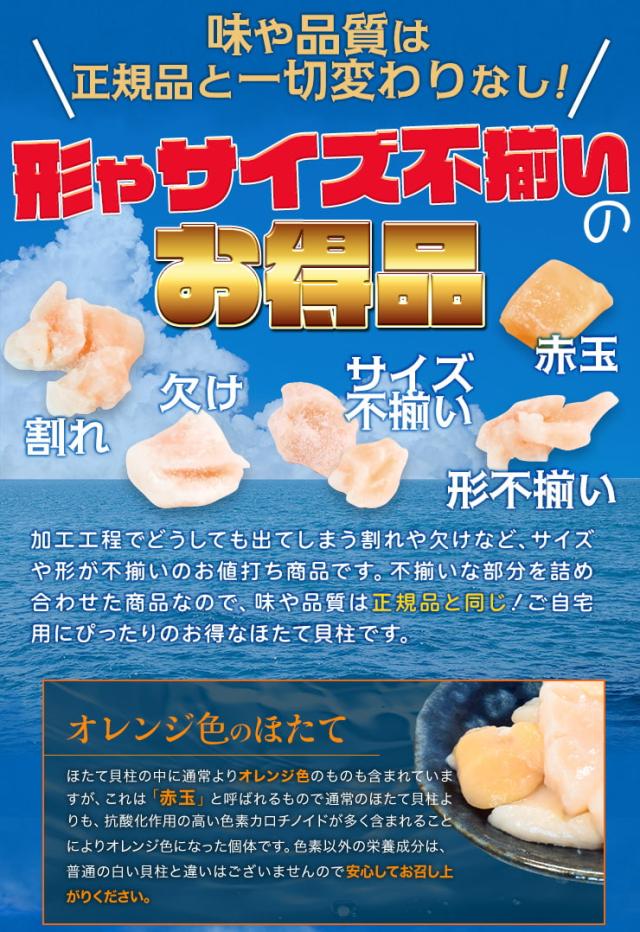 北海道の海で水揚げされた甘くて濃厚な旨味のほたて貝柱。欠け・割れ・サイズなど不揃いのお買い得品