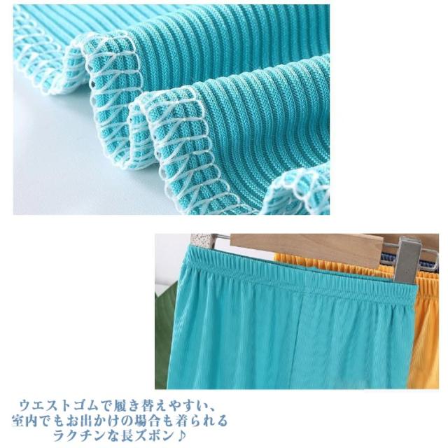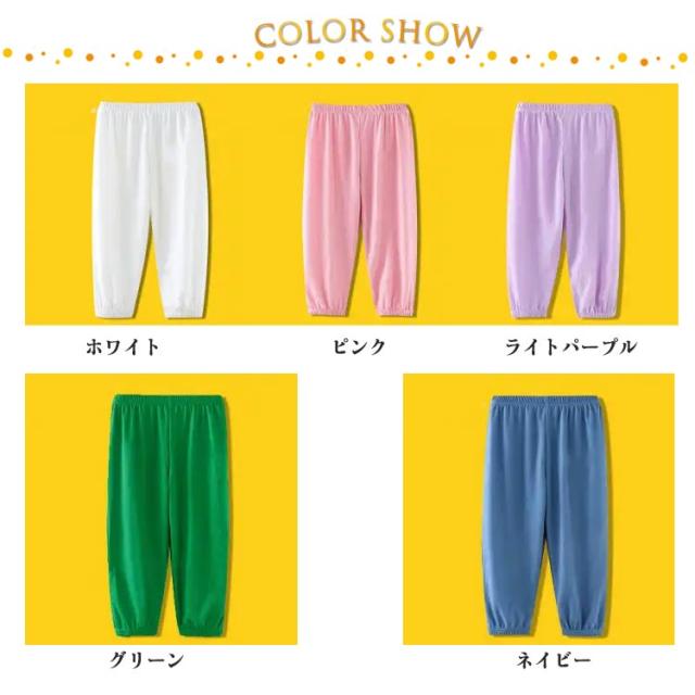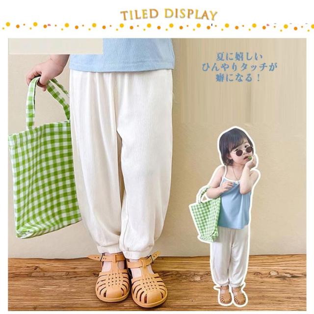 | なめらかでさらりとした感触が心地よく、薄手で真夏でも涼しく穿ける。夏に嬉しいひんやりタッチが癖になる! ウエストゴムで履き替えやすい、室内でもお出かけの場合も着られるラクチンな長ズボン♪ 真夏でも涼しく履ける通気性の良い涼しい長ズボンです。半ズボンと違い、紫外線や蚊や怪我からも保護されます。 薄手の生地で家でも外でも、保育園でもどこでも重宝します。 ウエスト部分はゴム仕様で、エアコンの冷房で就寝用のパジャマとしてもOK | |