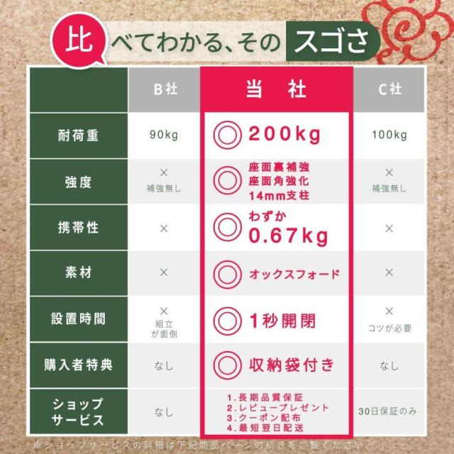 小型のチェアでありながら耐重量はなんと200kg。大柄な男性が座っても平気な丈夫さで、ご家族、お友達、みなさまお使いいただけます。座面の布は、パラシュートなどの布としても使われるオックスフォード。撥水性、耐摩擦性、通気性に非常にすぐれたアウトドアに最適な素材です。アルミ製の椅子よりもスチールで作られた折りたたみ椅子の方が他の椅子よりも丈夫で長持ちし、価格も手頃