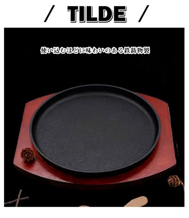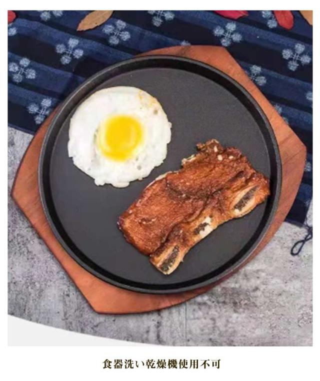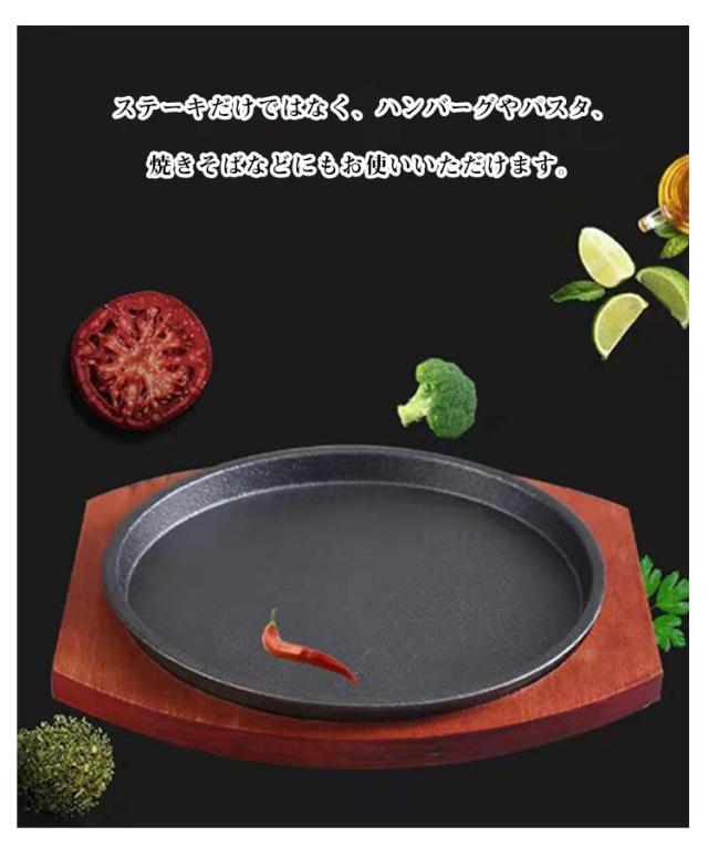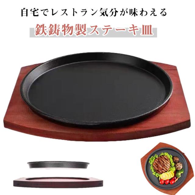 ステーキ皿 丸型 ステーキ皿 IH対応 お肉 業務用 ガス火 木製プレート 木台トレー付き 家庭用 円形 ステーキ 鉄板 敷板 キッチンツール 焼肉 21cm パスタ 焼きそば 家庭用 木台付き キッズ用 ハンバーグ 皿 鉄板小 鉄鋳物製