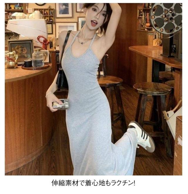 ロング丈 キャミワンピース 首掛け ロングワンピース ノースリーブワンピース きれいめ 夏 春 カップ付きワンピース カップ付き カップ付き マキシワンピース フレアワンピース 黒 グレー 選べる2丈 高身長・低身長向け 伸縮 カジュアル
