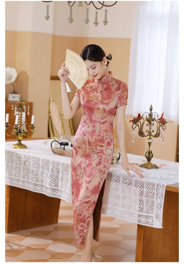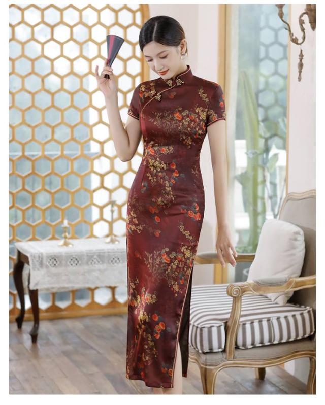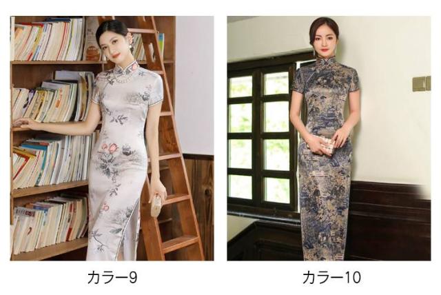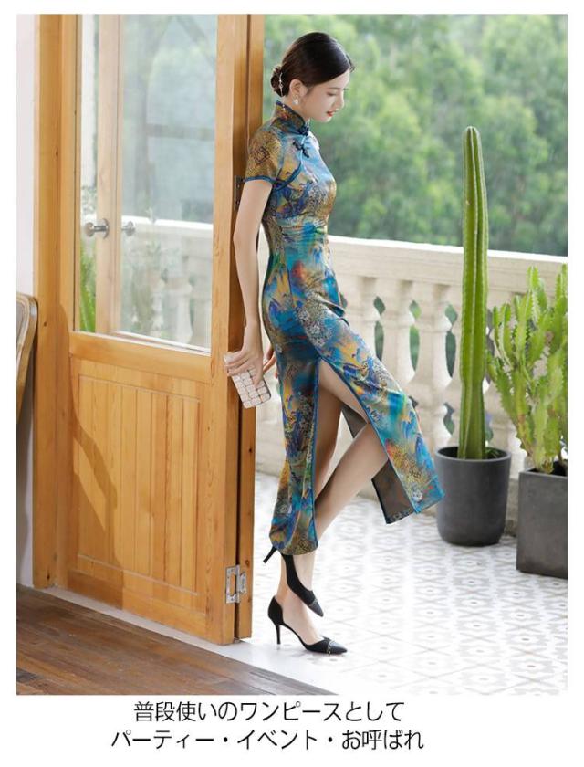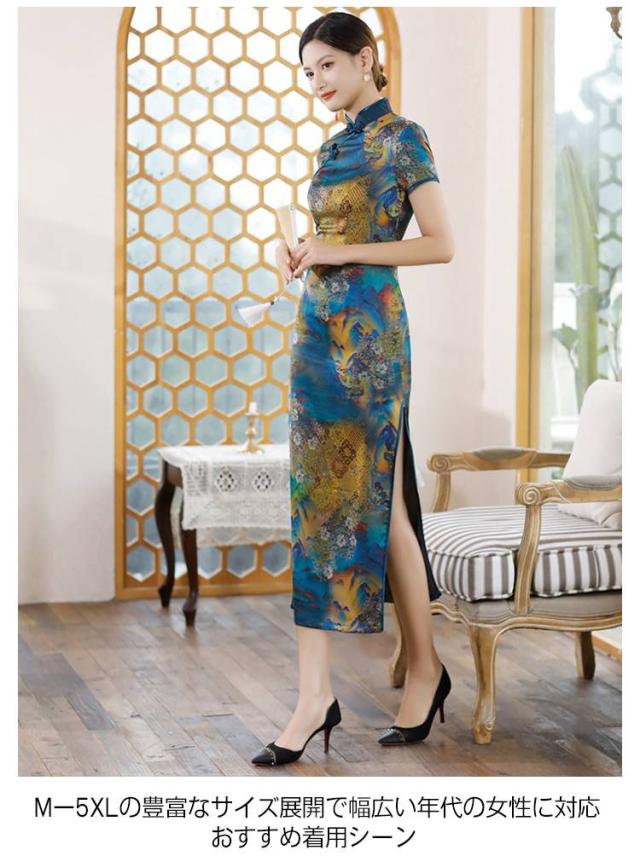 大人可愛い ロング 半袖 中華風 チャイナドレス 大きいサイズ チャイナ風ワンピース ドレス サテン チャイナドレス 夏ワンピース スリット セクシー M−5XL