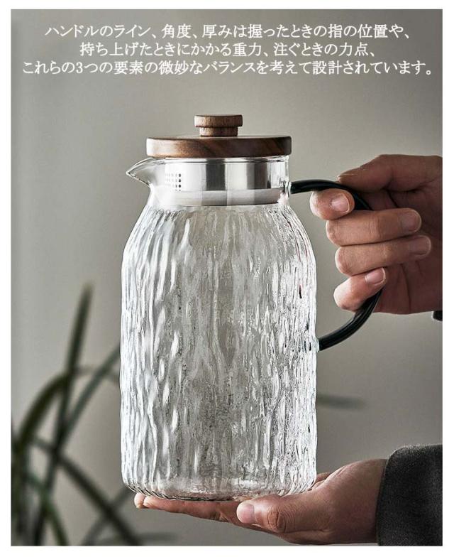 | 直火対応仕様!耐熱ガラスだからできる万能型ガラスポット♪1.3L 1.5L いつまでも 愛され続ける耐熱ガラスピッチャー ハンドルのライン、角度、厚みは握ったときの指の位置や、 持ち上げたときにかかる重力、注ぐときの力点、 これらの3つの要素の微妙なバランスを考えて設計されています。 上質感があり、様々なテーブルシーンにもあうデザインです。 耐熱ガラス製で清潔に保て、熱いお湯から作るものも安心です。 ミネラルウォータージャグとしてはもちろん、 夏は冷たいフレッシュジュースや麦茶、 アイスティーなど冷たい飲み物を手軽に作れてキープできるクールサーバーです。 冬には暖かいお茶など1年を通してお使いいただけます。 | |