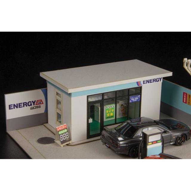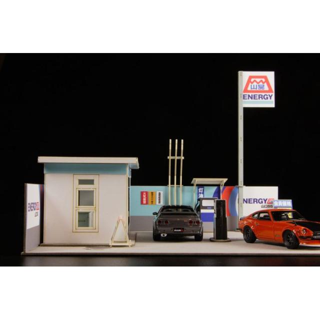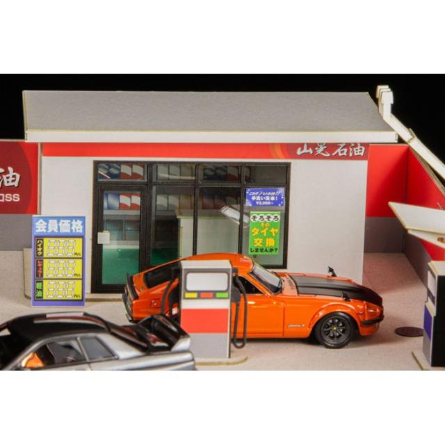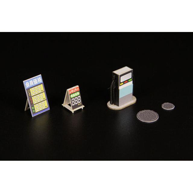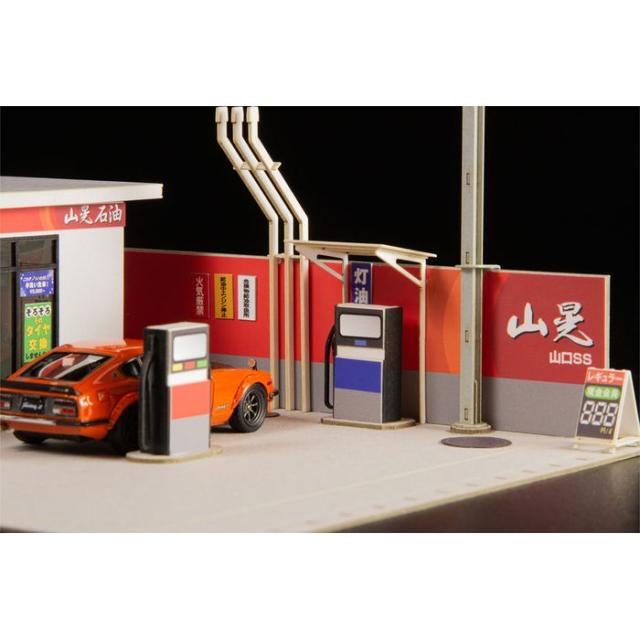 1/64サイズのスケールミニカーに合わせた給油機や壁際の通気管、町中でよく見る価格看板などをリアルに再現。