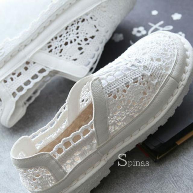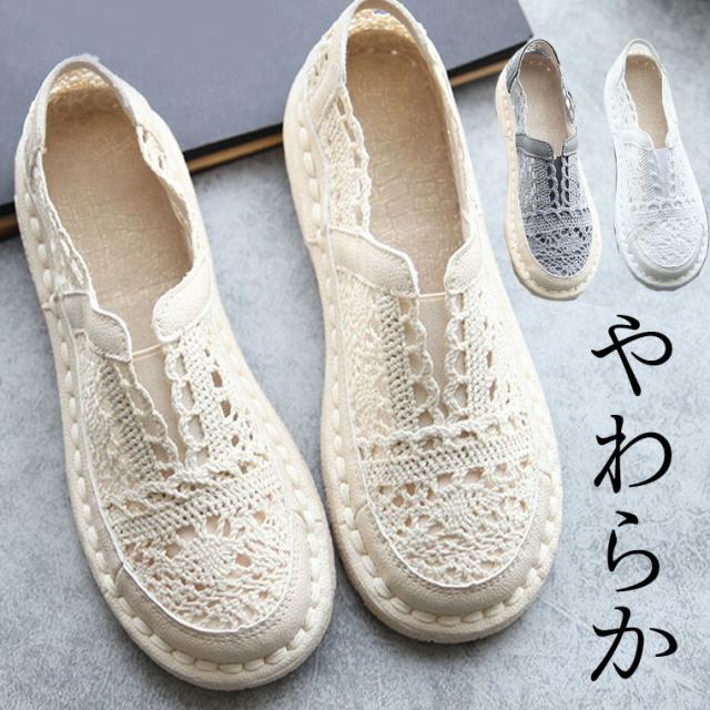 かぎ編みレースが涼しげ 40代 50代 大人可愛いコーディネート レーススリッポン 総レース カギ編み モチーフ やわらか ソフトソール 軽い 軽量 柔らか ソフト