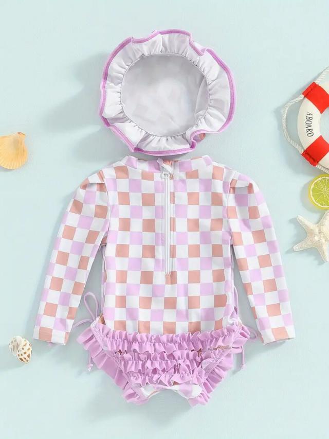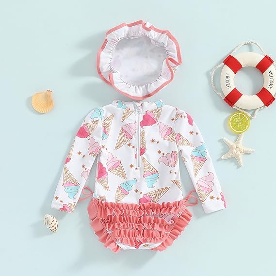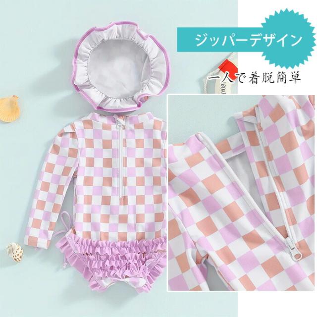ベビー水着 赤ちゃん 女の子 長袖花柄 水着 帽子付き スイムウエア 幼児用水着 ラッシュガード水着 かわいい甘いスタイル ビーチウェア 2点セット子供 UVカット 日焼け防止 プール スイムウェア