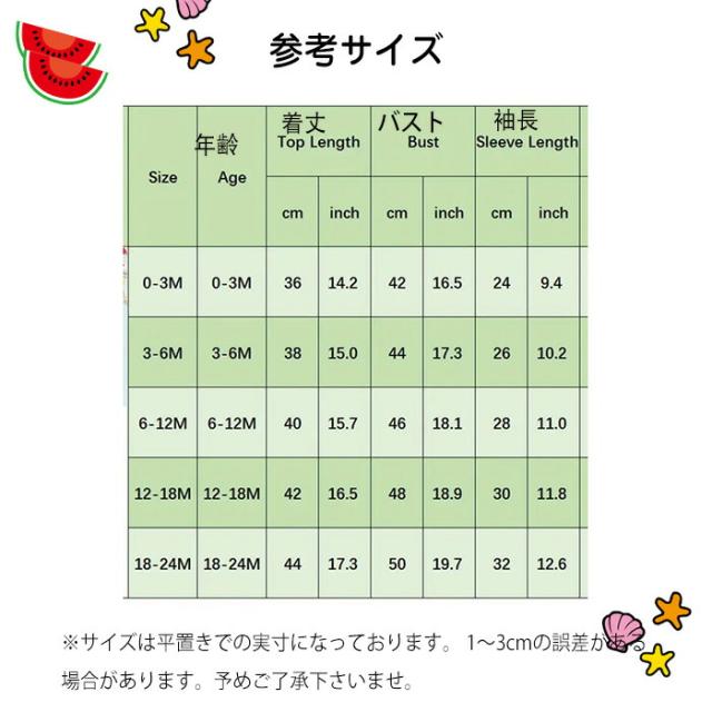 サイズ展開:0〜24ヶ月のサイズ展開で、赤ちゃんの成長に合わせてぴったりフィットします。