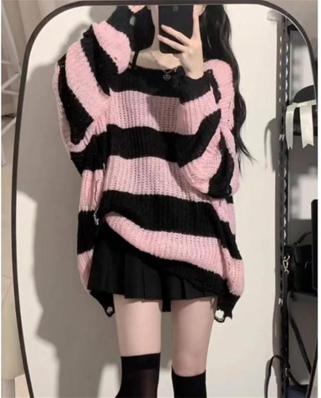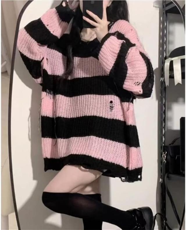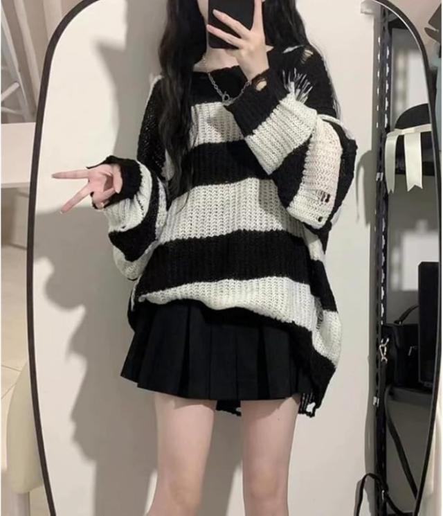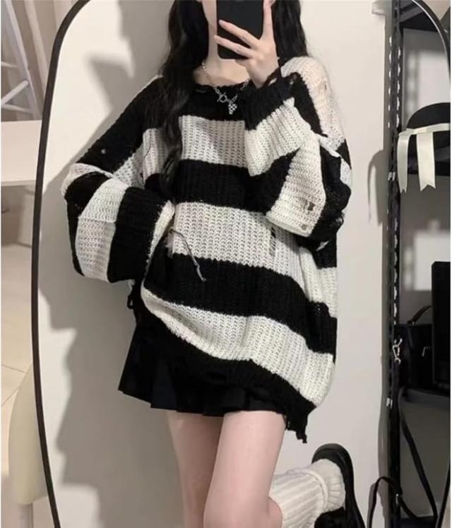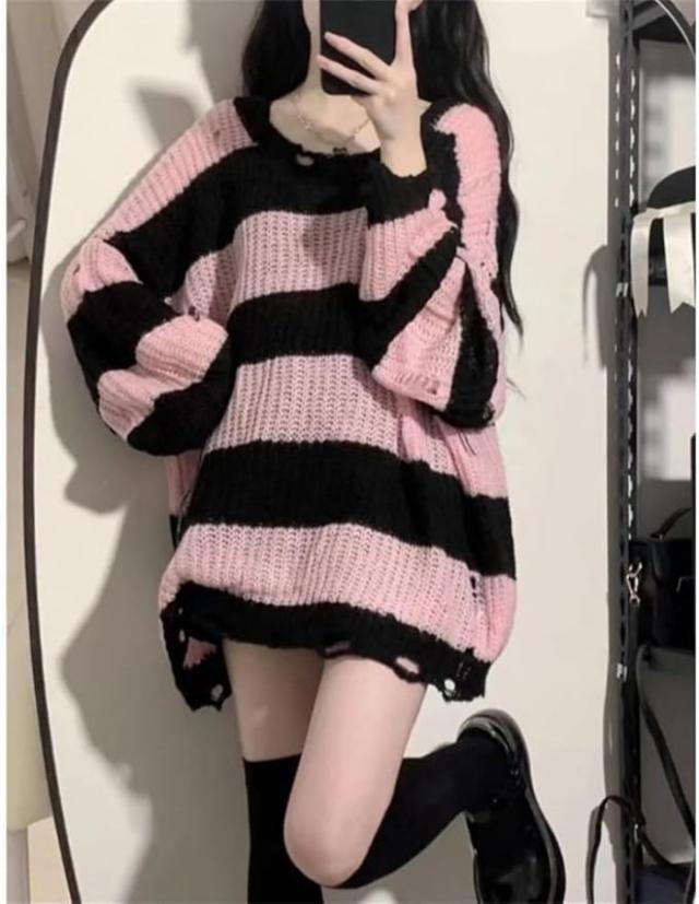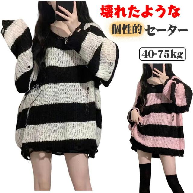 セーター レディース ダメージニット ストライプ 長袖 チュニックプルオントップス ゆったり カジュアル 原宿系 ストリート春夏秋服お出掛けデート 壊れたようなデザイン個性と態度を与えた衣類 おしゃれ
