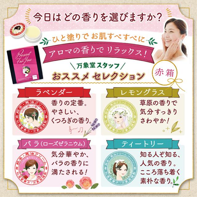 熊本特産の馬油にラベンダー・バラ・レモングラス・ティーツリー4種の精油を練りこみました。ギフトに、誕生日の贈り物にぜひお使いください。