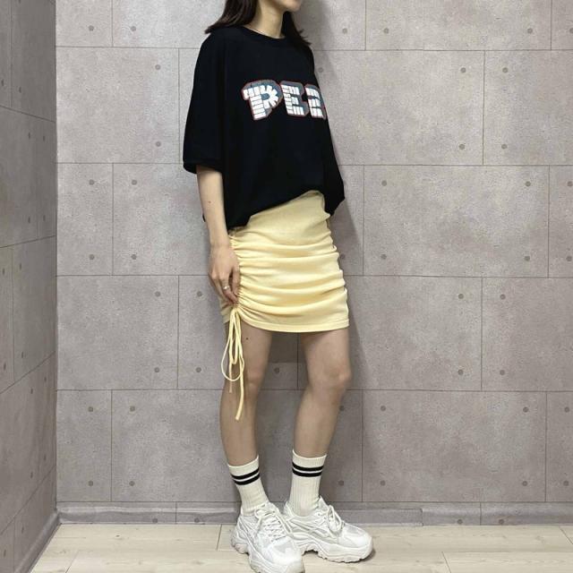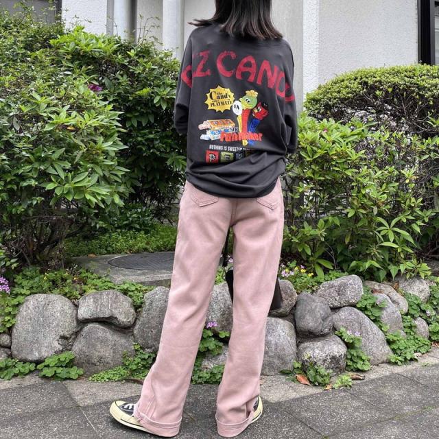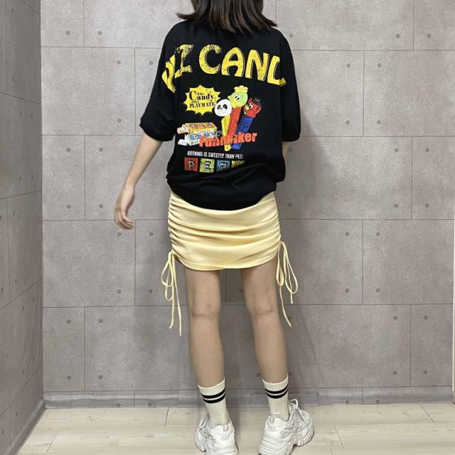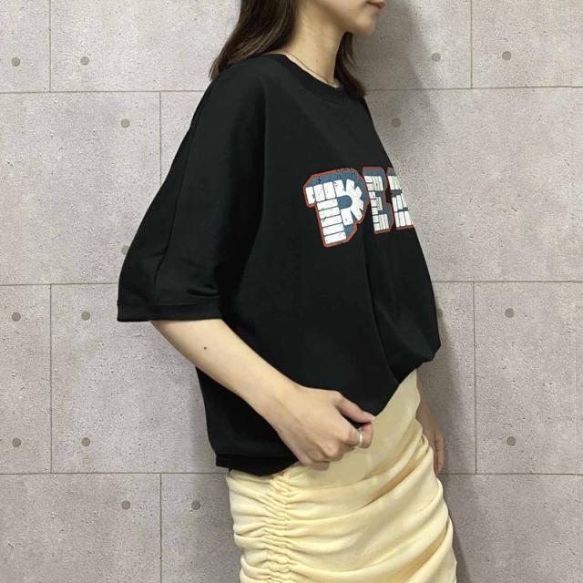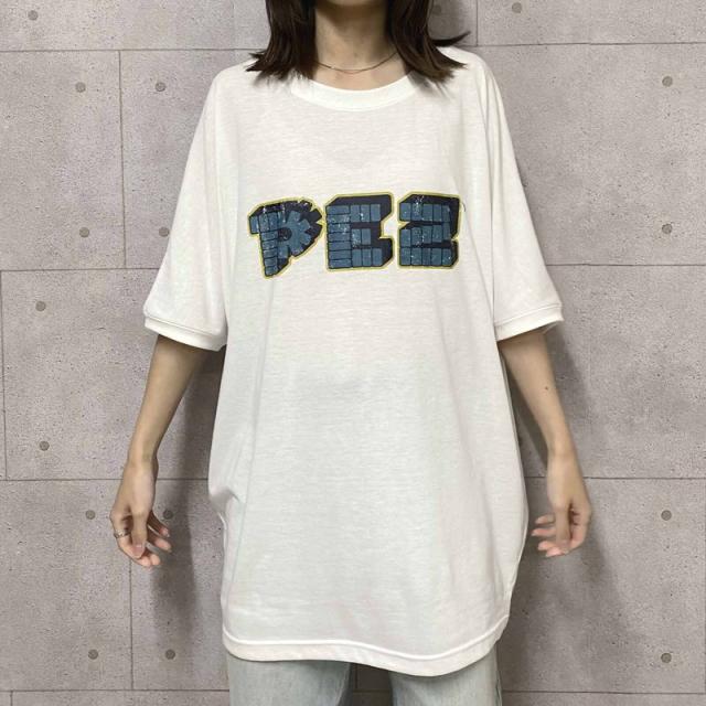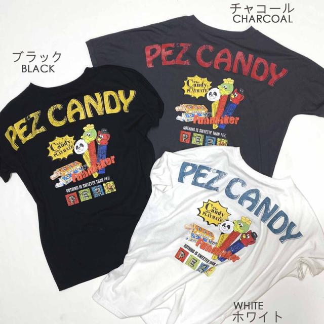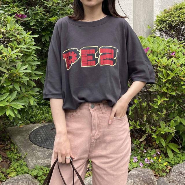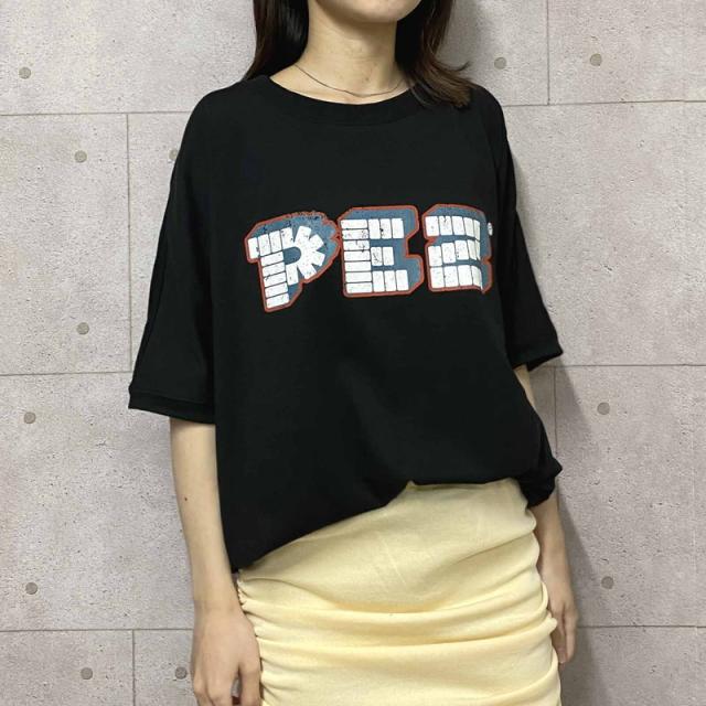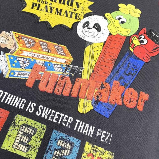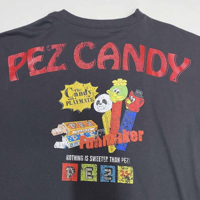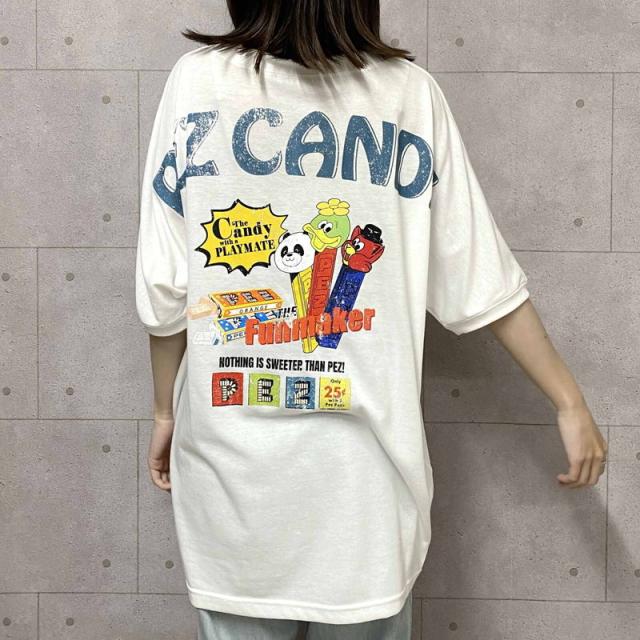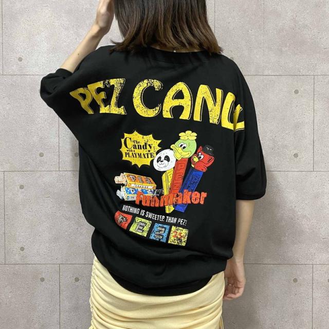 肩口まで連なったグラフィックロゴとお菓子のPEZの容器をプリントしたとっても可愛いキャラデインがインパクトあるバックプリント。
