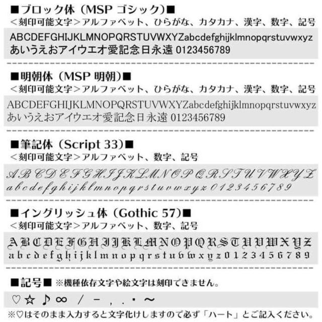 【字体】ブロック体、明朝体、筆記体、イングリッシュ体、数字、記号など