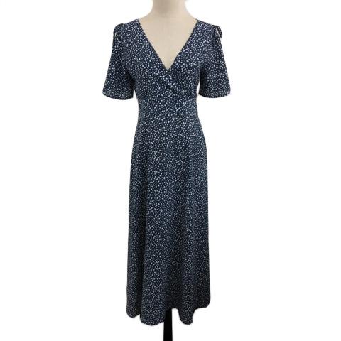 【中古】フィフス fifth ワンピース フレア ロング 花柄 総柄 リボン スリット 半袖 M 青 白 ブルー ホワイト