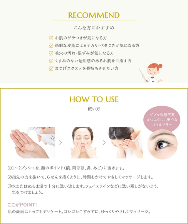 | STEP1 プレミアムナチュレクレンジング 1.1〜2プッシュを、顔のポイント(額、両ほほ、鼻、あご)に置きます。 2.指先の力を抜いて、らせんを描くように、時間をかけてやさしくマッサージします。 3.水またはぬるま湯で十分に洗い流します。フェイスラインなどに洗い残しがないよう、気をつけましょう。 <ここがPOINT!> 肌の表面はとってもデリケート。ゴシゴシこすらずに、ゆっくりやさしくマッサージ。 |
