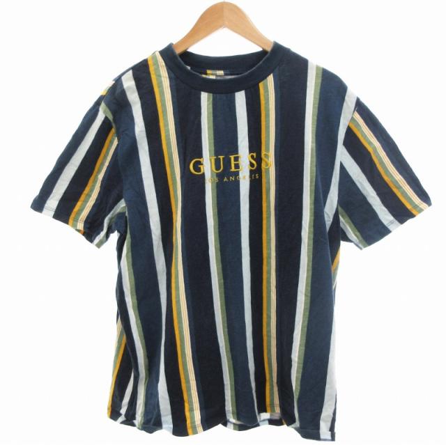 【中古】ゲス GUESS Tシャツ カットソー ストライプ ロゴ 半袖 L 紺 ネイビー 黄 イエロー /UD レディース